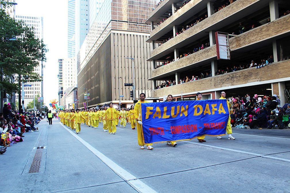当法轮功学员的队伍进入表演区时,在现场作直播的Khou(11)电视台主持人向观众介绍:“这是美南法轮大法学会。法轮大法是中国的传统气功,(今天)他们穿着黄色亮丽服装,非常好看。(他们的)横幅上写着:法轮大法,真善忍。”