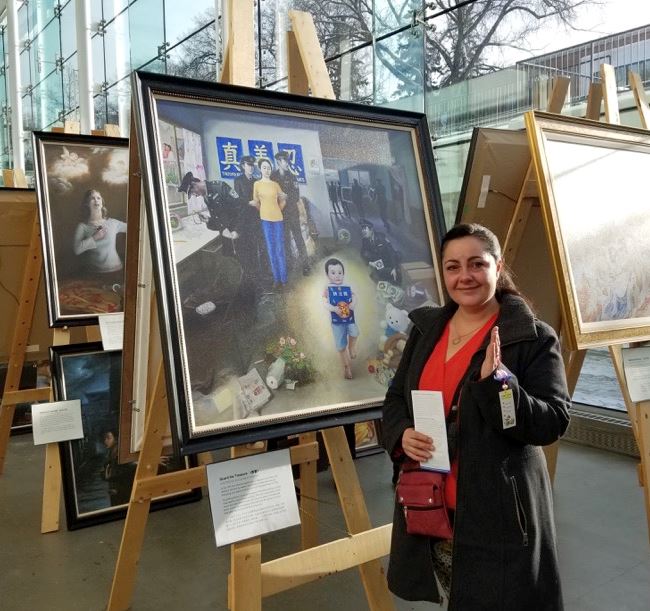 佳姿敏·波尼松尼女士(Jazmin Bonizzoni)看完畫展后表示,“作为第一代加籍智利人,我同情法轮大法追随者所经历的艰辛与迫害。这些作品激励我为世界更美好的未来而努力。”