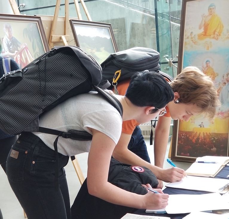 ![]() 图3:观看画展的学生主动签名呼吁加国总统帮助营救法轮功学员。 |