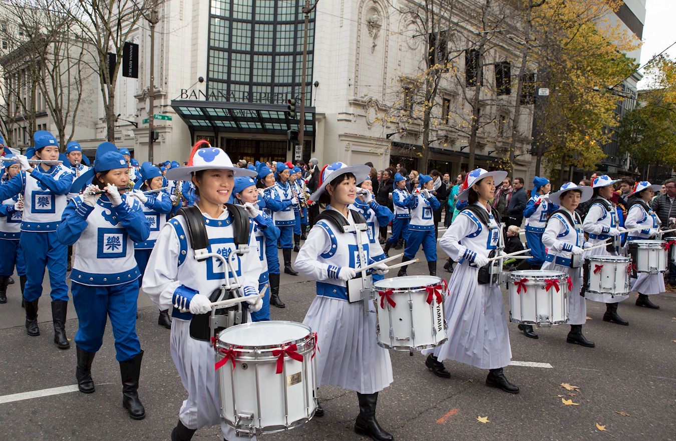法轮功学员的队伍由来自美国旧金山、西雅图和加拿大温哥华地区的法轮大法学员组成的天国乐团参加,这是该游行唯一一个主要由华人组成的军乐队,成为这个一大亮点,吸引了所有观众的注意力,展现着法轮大法和“真、善、忍”的美好。