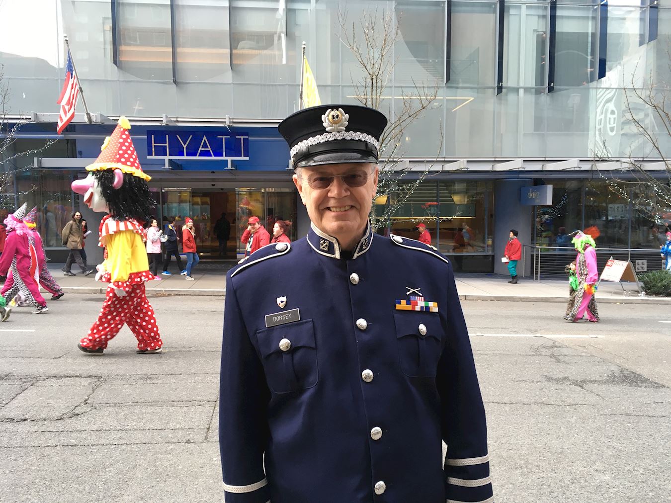 Dorsey先生是今年游行护旗队(color guard)的一名成员,他曾服役与美国陆军,参加过越南战争,游行结束后,他来天国乐团的队伍前,与数名乐手交谈。天国乐团的一位法轮功学员告诉他,乐团的独特之处不仅是大部份成员为华裔,更是因为每个人都是法轮功修炼者,其中一些甚至在中国大陆受到过迫害。他听到后感到震惊并问:“真的吗?”他说:“我曾听说过法轮功这个名字,但从没有多做了解,通过今天的交谈我了解到了很多。我一定会上网再了解法轮功及其受迫害的真相。祝他们(法轮功学员)好运。”