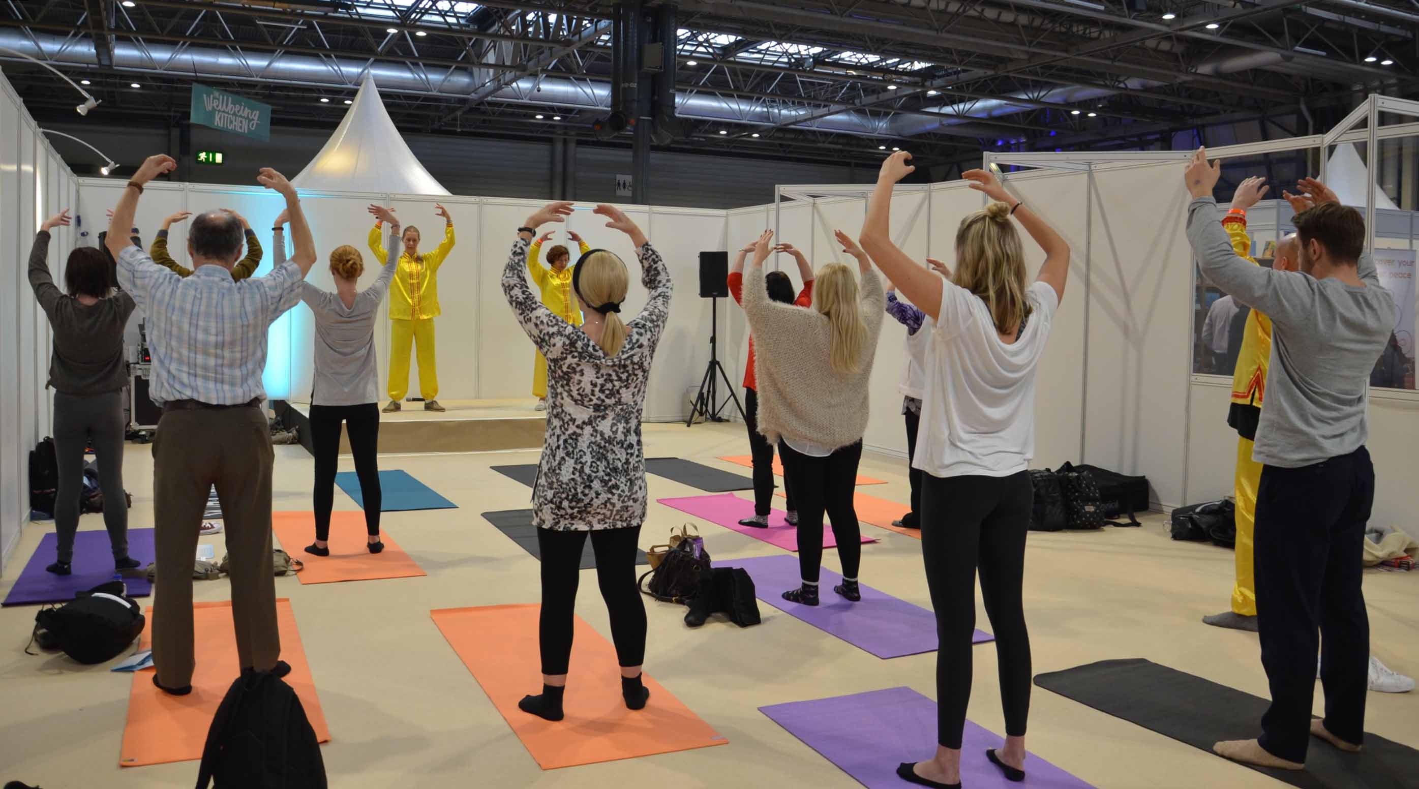 ![]() 图2:法轮功学员在健康节上举办讲座介绍法轮功并义务教功,许多民众当场学炼功法。 |