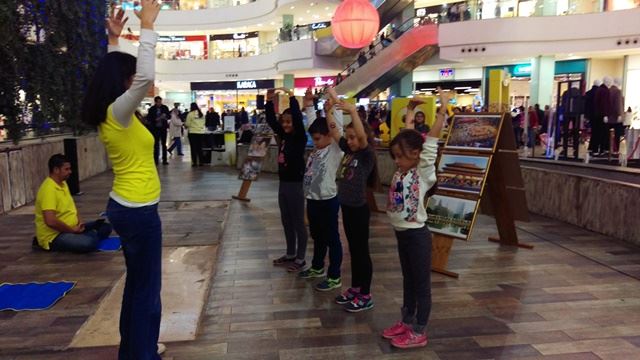 当天,从上午十点到晚上十点,法轮功学员在购物中心持续炼功、派发真相传单,他们还摆放真相图片展板,告诉人们中共十八年来对法轮功的残酷迫害。