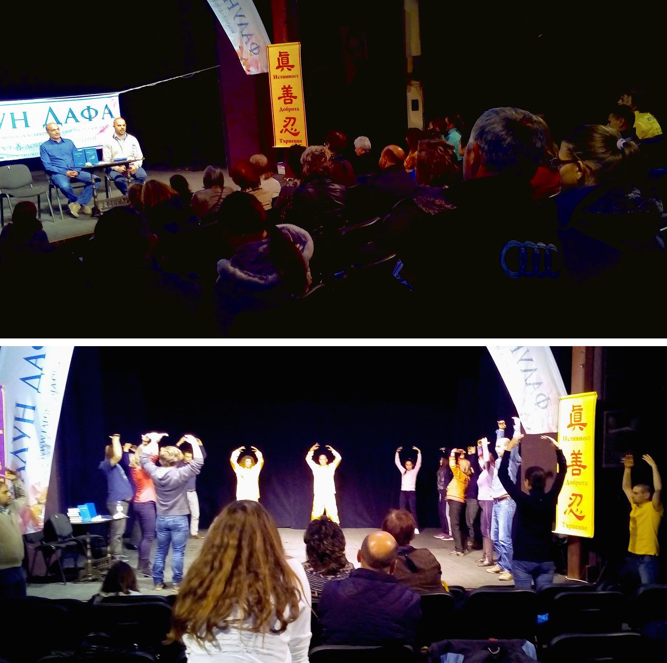 ![]() 图2:在Smolyan的Cmolyan剧院介绍法轮功和教功 |