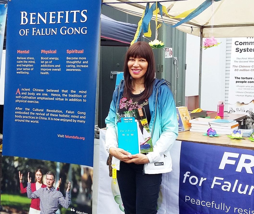 威尔逊(Wilson)夫妇走到法轮功展位前询问是否可以买一本法轮功的书籍。安娜(Anna Wilson)告诉法轮功学员,她学过气功和功夫,她听说法轮功对人身心有益已经很长时间了。但是她没有机会真正接触法轮功,只是偶尔有一次匆匆经过中国城看到法轮功时,她签名支持法轮功反迫害。她说:我知道并赞赏法轮功的真、善、忍原则,所以我很想买《转法轮》去拜读,并开始修炼法轮功。