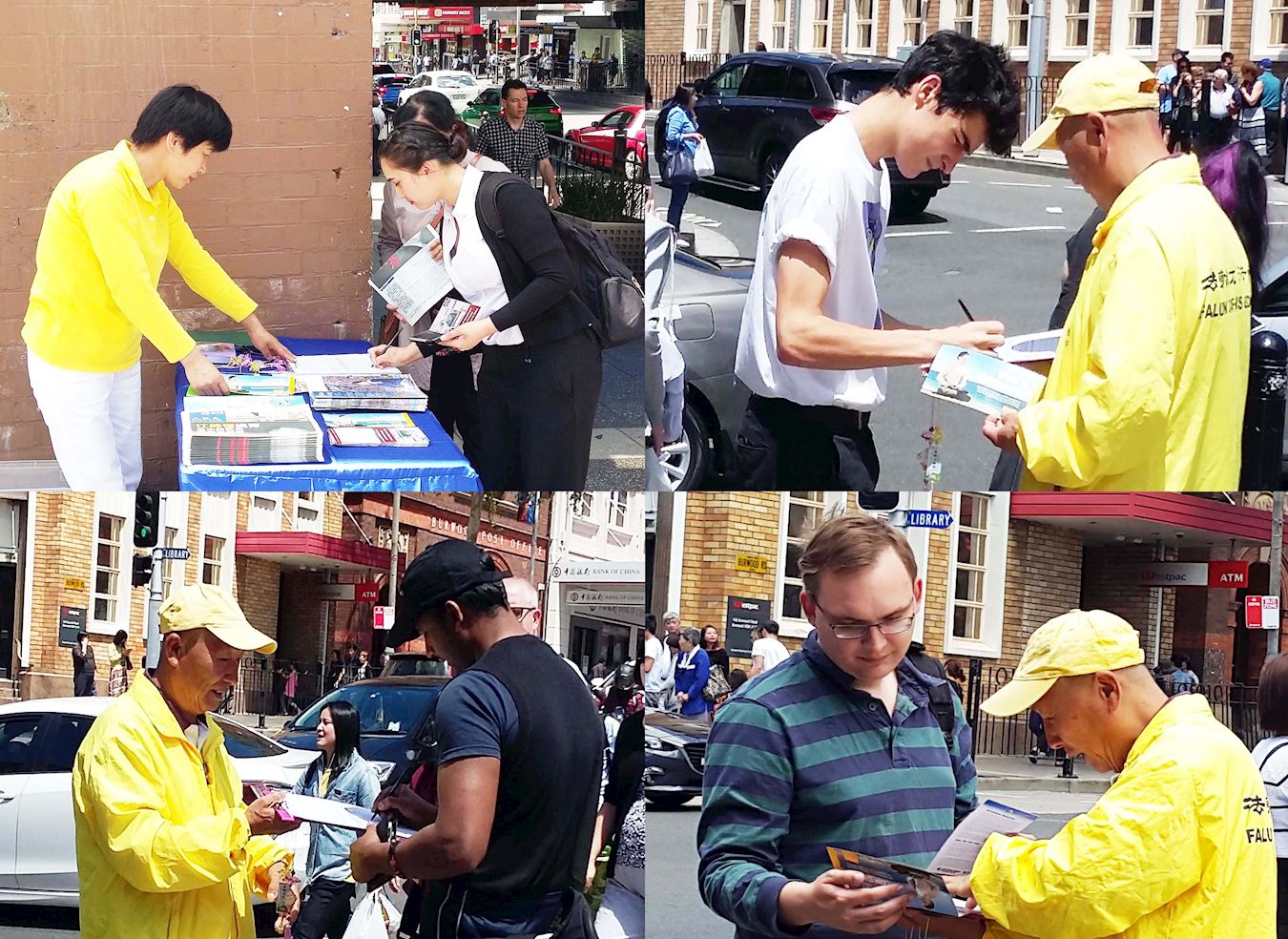二零一七年十一月二十五日周六中午,法轮功学员在悉尼西南部的中央商务和行政中心Campsie的主街上举行反迫害征签活动时,购物华人一般都会往返于法轮功展位前,有的表示我很早就知道法轮功,我已做了三:退.,感谢你们;有的会来签名声援“诉江”和反“活摘”;还有的已经知道法轮功好,也知道要做三:退.,但是就是不能下决心真正退出中共党、团、队组织。