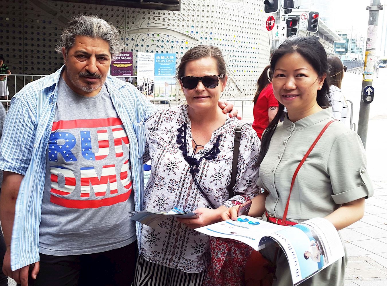 当地澳洲人娜塔莉·劳伦(Natalie Lauren)和先生路过法轮功真相展位时,劳伦女士因在此前已了解“活摘”真相,她今天特别希望尽己所能帮助法轮功,她表示:“非常感谢你们在这里呼吁制止‘活摘’并保护在中国的法轮功学员,因为我阿姨在澳洲也做过肺移植手术,我知道她做手术时的经历有多困难和痛苦,而且器官供源是那么的有限。中共政府和军队参与‘活摘’贩卖器官是最邪恶的行径。法轮功学员炼功是那么祥和美好,何罪之有呀?而这迫害发生在当今世界是多么的可悲!‘真、善、忍’这么美好,任何人都不应反对他啊!”