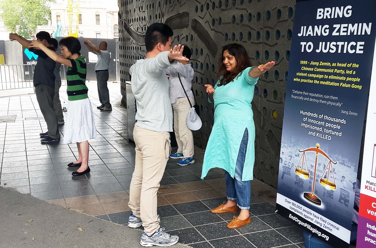 当天不同族裔民众都有希望学炼法轮功的,包括印度裔和华裔。活动当天早上法轮功学员阿丽娜(Alina)正在教一位华人女士炼法轮功时,印度裔赛斯女士(Seewaa Seth)走过来学功,她表示:“我妈妈经常看到你们在这里炼功,感觉到祥和的能量场,她催促我一定要带她一起去学炼这个功法。我自己有打坐经验,刚刚学了第一套功法后,我就能感觉法轮功能量场很好、非常强大。”