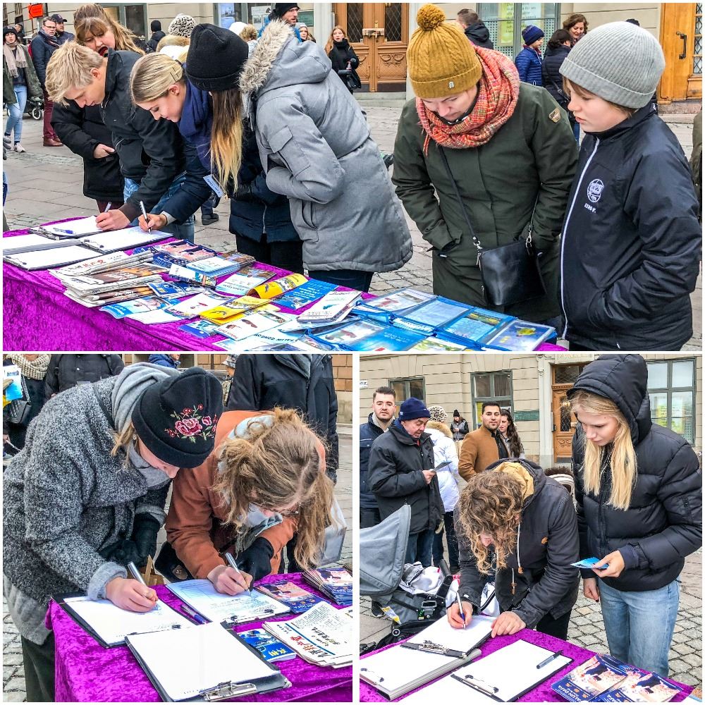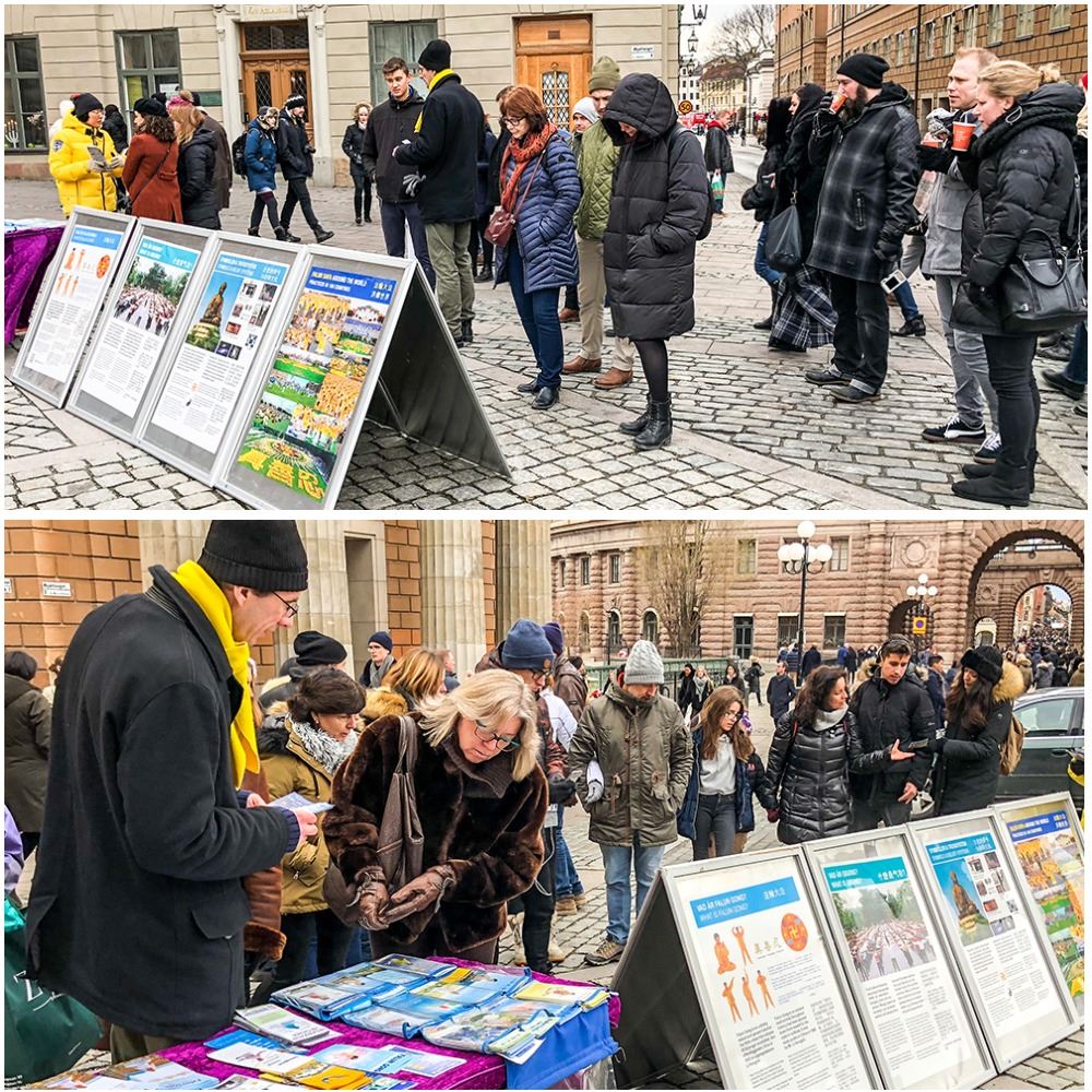 在斯德哥尔摩市中心、最热闹地皇宫旁的钱币广场上,瑞典法轮功学员一如既往地在这里举办活动,向各界民众讲述中共迫害法轮功的事实真相。