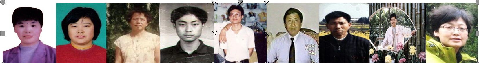南昌市被迫害致死或含冤离世的法轮功学员(左起):张淑君、葛佩玲、刘逢春、金遵义、王昕、胡庆云、朱世真、万里骥、吴井军