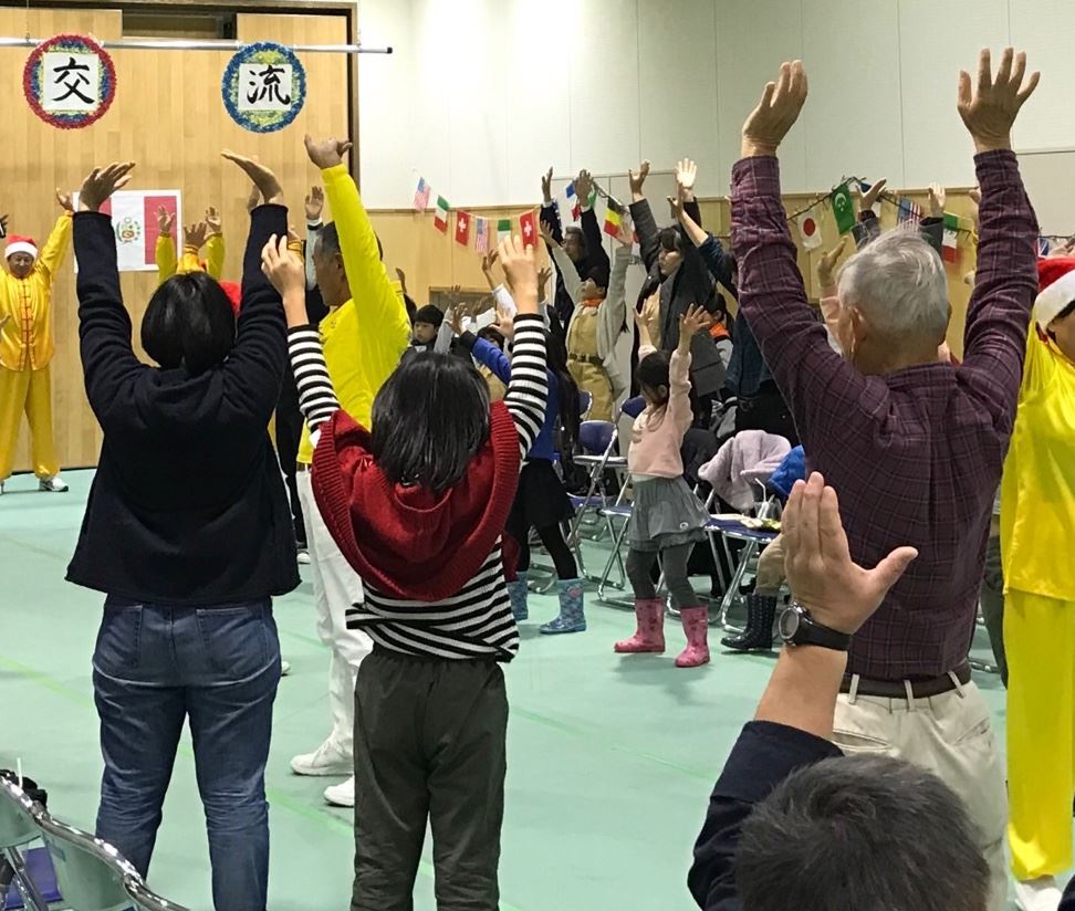 法轮功学员开始功法介绍时,在场观众全体起立,讲解的学员在前面对功法动作进行讲解,同时另一部份学员演示功法动作,在场的几乎每一位观众还有工作人员都在跟随着一起炼,并且非常认真和专注,讲解完功法之后,紧接着法轮功学员开始功法展示,伴随着舒缓的炼功音乐,与学员们功法展示的同时,在场观众与学员融为一体一同炼功,场面非常祥和。