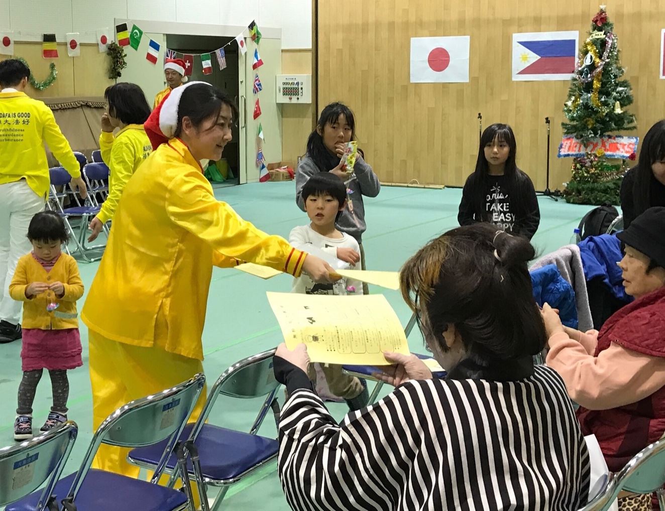 法轮功学员的表演结束后,学员给观众又发送了纸折小莲花和法轮功的介绍资料,大家都非常喜欢和感兴趣。有位老者兴奋地向学员表示:“功法动作非常舒缓,而且越炼身体越热,感觉真是太好了!”