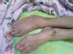 在被非法关押期间,霍润芝在身体和精神上都受到了非人的折磨,致使身体多处受伤,全口牙齿全部被打活动了,出现严重高血压症状,直肠肿瘤,身上多处伤疤,瘦得皮包骨,生命垂危。(见图片)