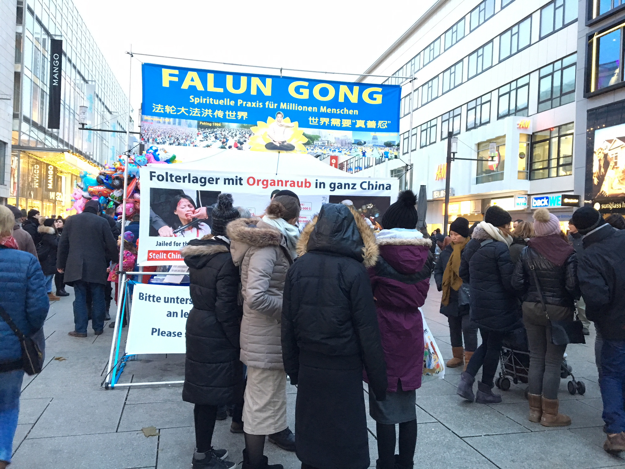 十二月九日,法轮功学员还在市中心最繁华的柏林大道旁搭起了展台。那儿是中国游客必经之路。他们在街边挂起了“法轮大法好”、“真善忍好”、“中国不是中共”等大横幅,还摆放了一些讲真相的中文展板。展位正对面是中国游客上下车的地方。成群结队的中国人路过法轮功展台的横幅展板时,有的观看,有的立即拍照,有的交头接耳:“快看!法轮功!”
