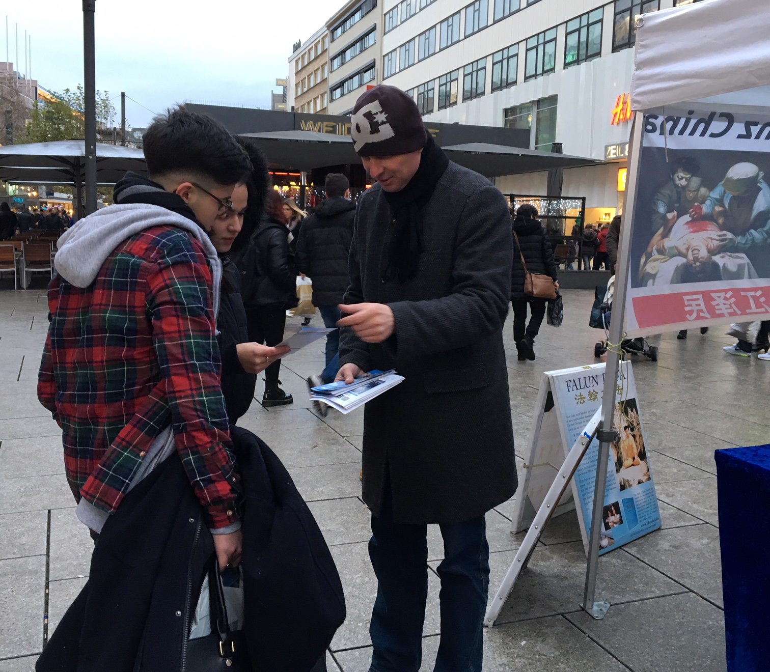 西人法轮功学员Dima Guskovs 和Sabine Rebling来自周边城市,也参加了支持活动。Dima Guskovs说,他很高兴参加这次活动,没想到遇到这么多有正义感、对法轮功很有好感的人。他介绍说,有两个十多岁的男孩,向他了解什么是法轮功,中共为什么迫害她。“当时天气很冷,两个小男孩一直用心地听。之后,他们要和我一起给行人发传单。”Dima Guskovs说:“我真没想到,那么冷,他们就不停地给人发。最后和我告别时,还拿走一打传单,对我说,让他们的同学也知道真相。”