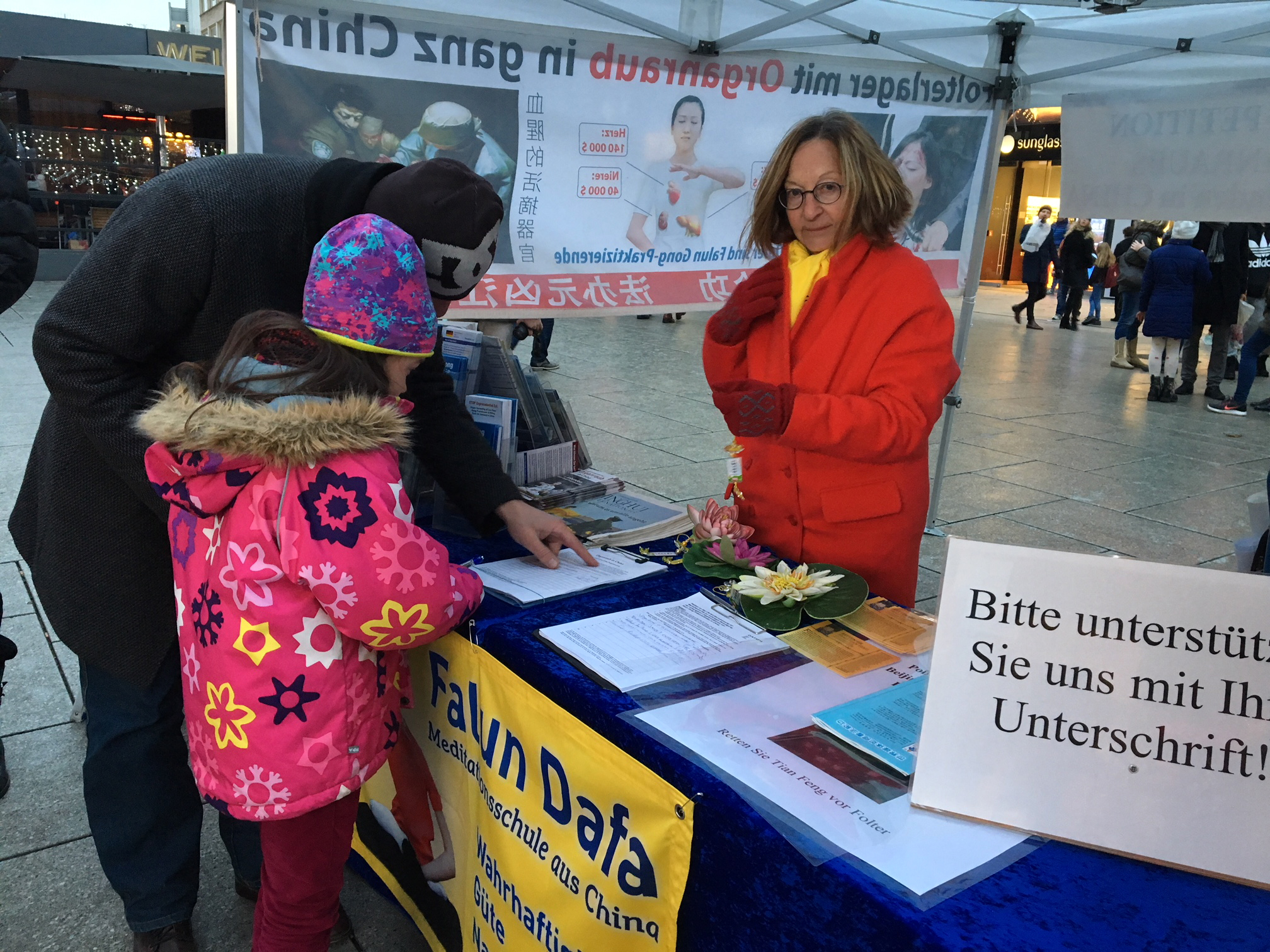柏林大道旁有好几家中餐馆和免税店,是中国游客必去的地方。他们往往会聚集在店外等人或聊天。这个时候,法轮功学员就会向他们发报纸,举真相展板,或打开小喇叭播放真相。