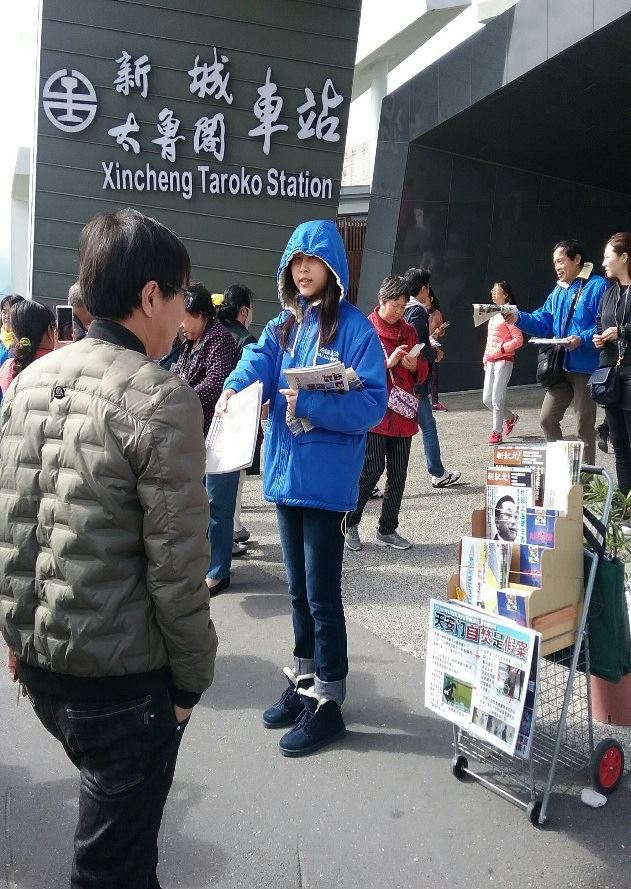【明慧网二零一七年十二月十八日】台湾花莲法轮功学员在二零一七年圣诞节前夕,来到大陆游客来台必经的旅游之处——新城乡太鲁阁火车站传真相劝三:退.(退出中共“党团队”),传递法轮功的美好,让更多的大陆游客知道真相,为自己选择一个美好的未来。