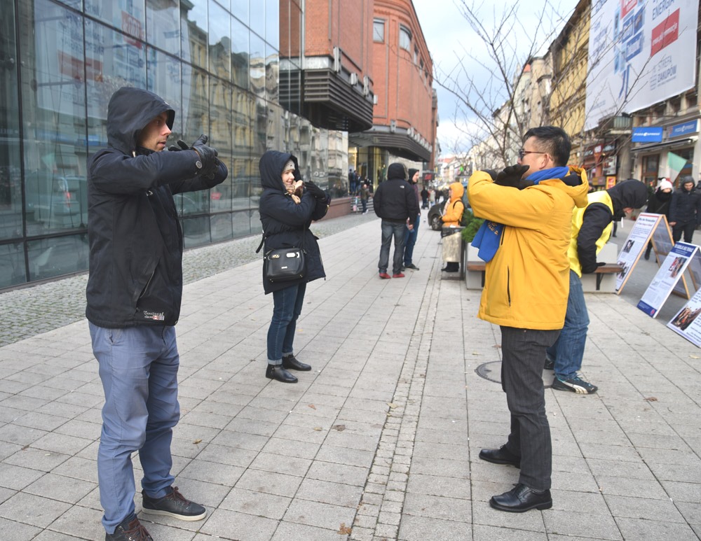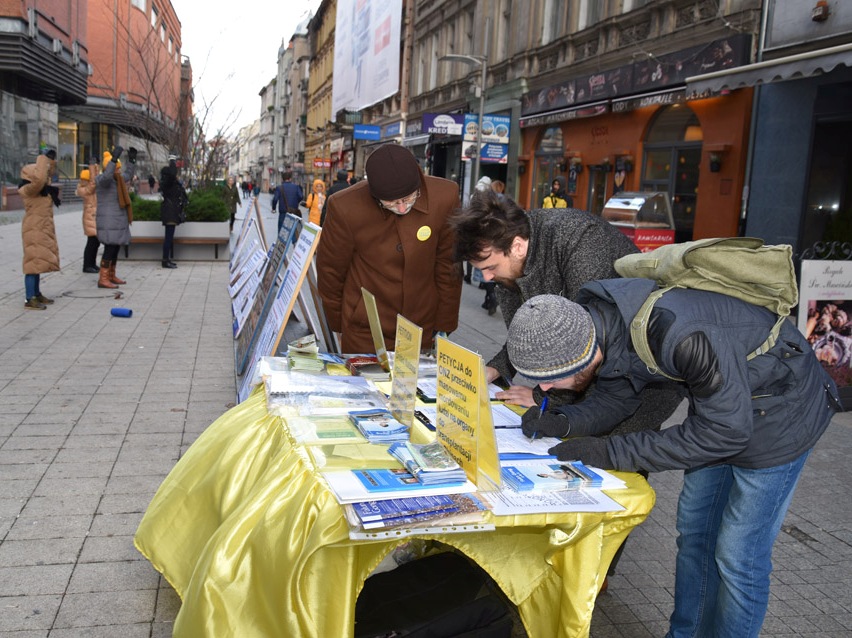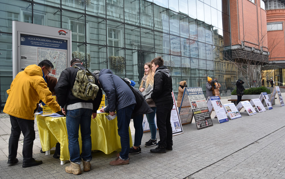二十六日,波兰法轮功学员又来到市中心,征签台还没有摆好就有人来要求签名。了解真相的人都说:我们欢迎真善忍法则,不论哪里都是需要的,今天的世界就是丢失了这些原则才变得不好了。为什么中(共)国还要镇压,还要害死这么多坚持真善忍的好人呢?我(们)支持法轮功,你们做得好,中共一定会受到上天惩罚的!