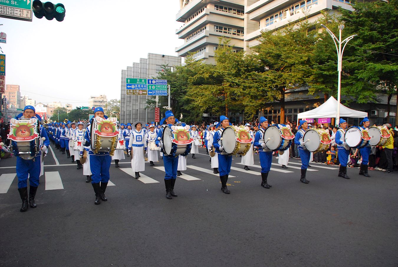 由两百多位法轮功学员组成的天国乐团,队前有拿着绣有“法轮大法”字样蓝色横幅的前导团员。军乐队从中山路到体育场,全程近三公里,沿途市民看见雄壮的天国乐团都雀跃不已。