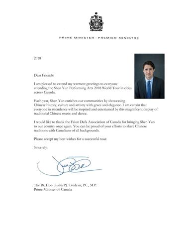 加拿大总理贾斯廷·特鲁多(Justin Trudeau)为神韵演出送上最美好的祝福,并祝愿神韵二零一八全球巡演持续成功。