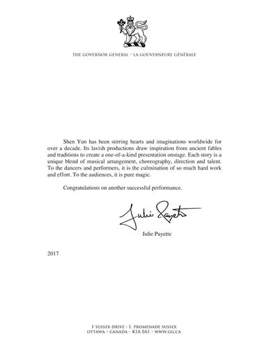 加拿大总督朱莉·帕耶特(Julie Payette)在给神韵的贺信中写道:“过去十几年来,神韵在全球(演出)震撼着人心,激发着人们的想象力。”