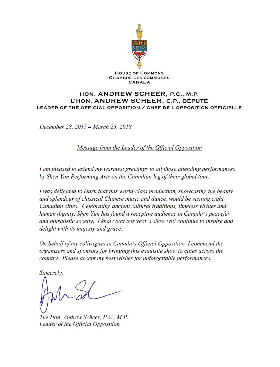 加拿大联邦反对党领袖,保守党国会议员安德鲁·希尔(Andrew Scheer)在贺信中写道:“我非常高兴能向观赏神韵艺术团全球巡回加拿大站演出的所有观众,表达我最热情的问候。”