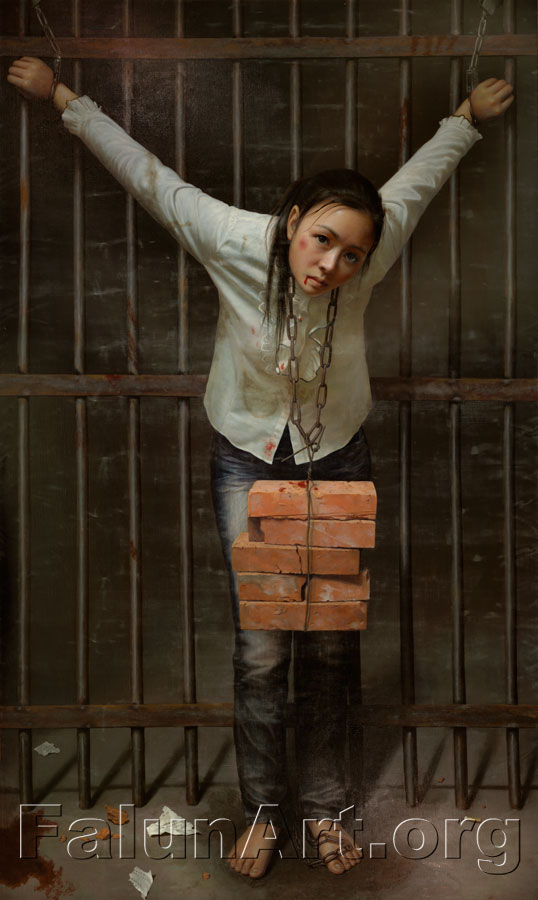颈吊砖块:五十三岁的葛玲被狱警在脖子上吊挂砖块,把她的左右手分别轮流反绑脖子上,另外还要吊四块湿砖头,后来增加到六块。再把手铐上吊起来,仅脚尖点地,长达四十个小时。葛玲遭受这种极度痛苦的酷刑折磨,生命处于垂危之中。
