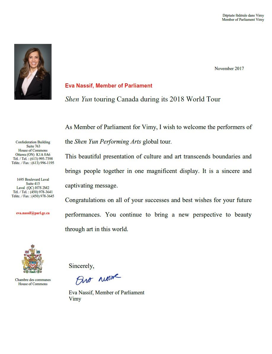 联邦自由党国会议员伊娃·纳西夫(Eva Nassif)在给2018神韵全球巡演的贺信中说,作为Vimy选区的联邦国会议员,“我要欢迎神韵艺术团世界巡演的艺术家们!”