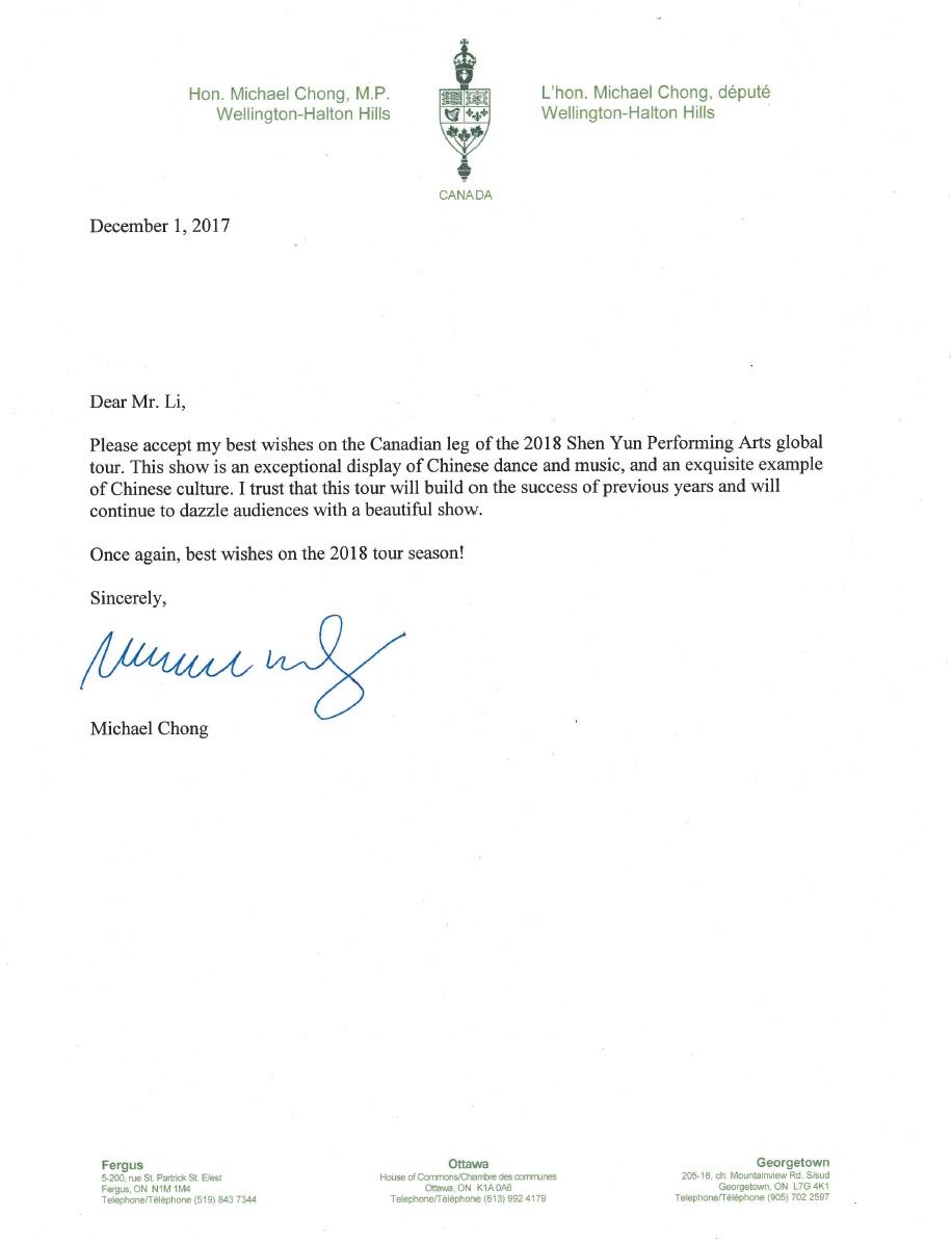 联邦保守党国会议员庄文浩(Michael David Chong)在贺信中写道:“请接受我对2018年神韵艺术团世界巡演加拿大旅程的最真挚祝福!”“神韵演出是中国舞蹈和音乐的出色再现,是中华文化的典范。”