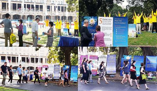 ![]() 图1~2:法轮功学员在市中心贝尔莫公园(Belmore Park)的主街上展示法轮功的五套功法和真相展板 |