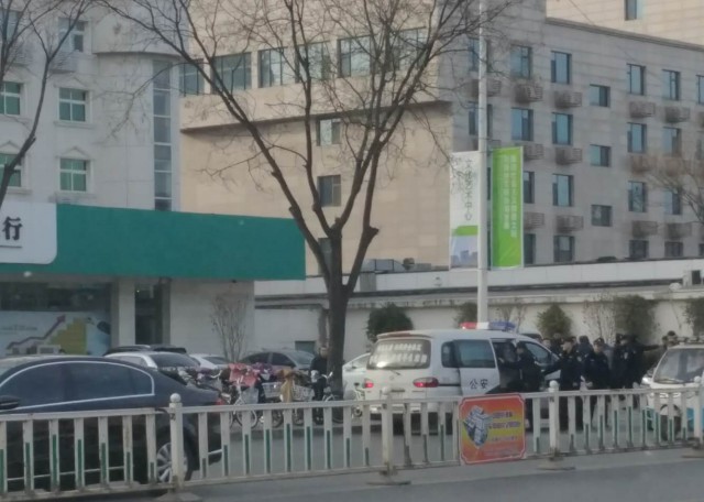 当天上午八点五十左右,两辆警车拉着十余个警察,来到法院大门西侧,一个头目开始交代任务,然后每辆车上两个警察,开始在法院大门两侧的红绿灯之间绕圈、巡逻,其余五六个警察在大门口附近监控监视。不一会,过来很多各乡镇政法委、综治办人员以及国保便衣,顿时恐怖氛围笼罩法院周围。