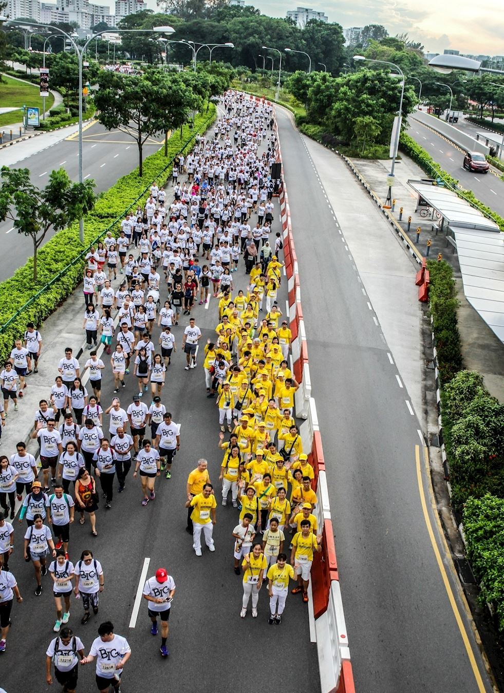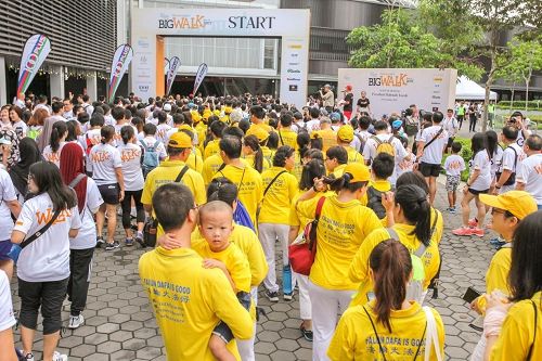 【明慧网二零一七年十二月四日】二零一七年十一月二十六日清晨,每年一度的新加坡大竞走拉开帷幕,早上七时左右,上万国人聚集在新加坡体育馆,此次大竞走全程八公里。从国家体育馆出发,途径美丽的滨海湾、观景轮、滨海花园、F1赛车道,大约四小时的路程。今年六十多位法轮功学员参与这项活动,法轮功学员身穿黄色衣服和白色裤子,在人群中格外醒目。