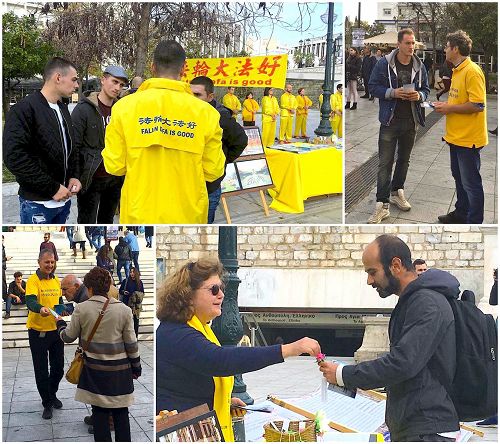 二零一七年十二月二日下午二点,希腊法轮功学员在首都雅典宪法广场上一如既往地拉开真相展板,挂出法轮大法好的横幅,摆好征签台,学员们有的炼功,有的散发传单讲述法轮功的美好,和十八年来法轮功在中国大陆被迫害的真相,呼吁人们携手共同制止这场残酷的迫害。