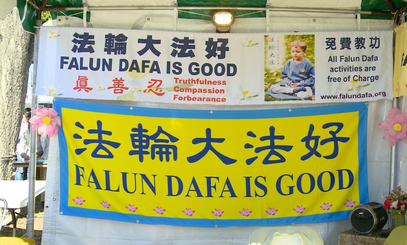 所有经过的人都会看到展位,很多华人看到“法轮大法好”五个醒目的大字,都情不自禁地喊出:“法轮大法好”!有的人声音还很响亮。