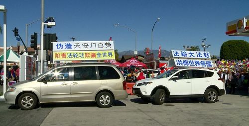 此外,由于洛杉矶地域大、分布广,民众多以车代步,所以法轮功学员设计制作了“真相车”——在自己的座车车顶安装了真相板,在繁华路段上行驶,公共停车地停泊,让过往车辆和民众观看到真相,很多人还拍下照片。