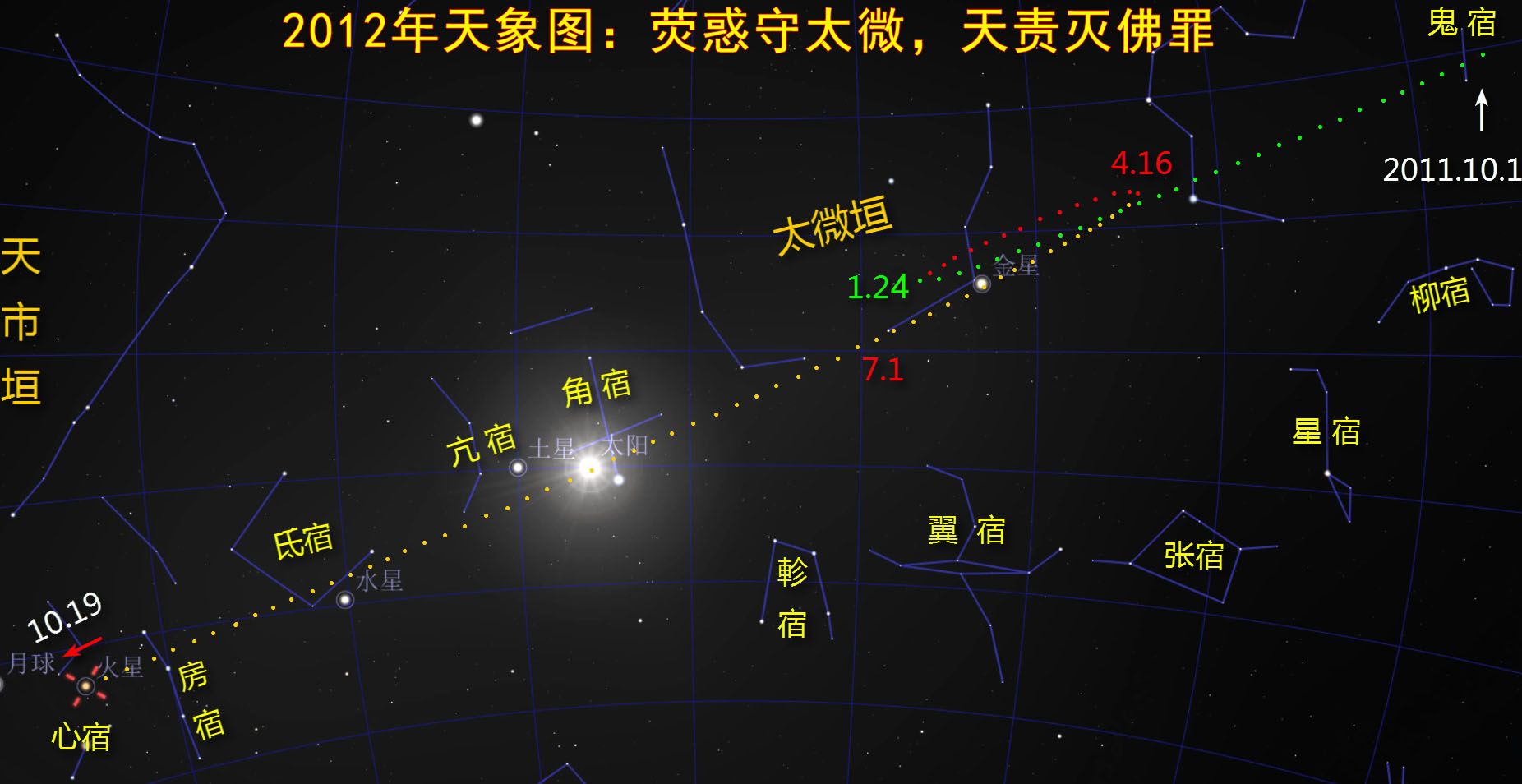 到2012年的“荧惑守太微、天谴灭佛罪”的天象,当然对应着小丑江泽民的命终,红朝崩解(7月1日被火星所犯),迫害结束,而后开始法正人间,这是高层旧势力对正法延续10年的一个设计。