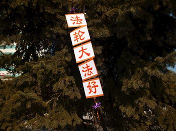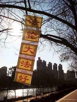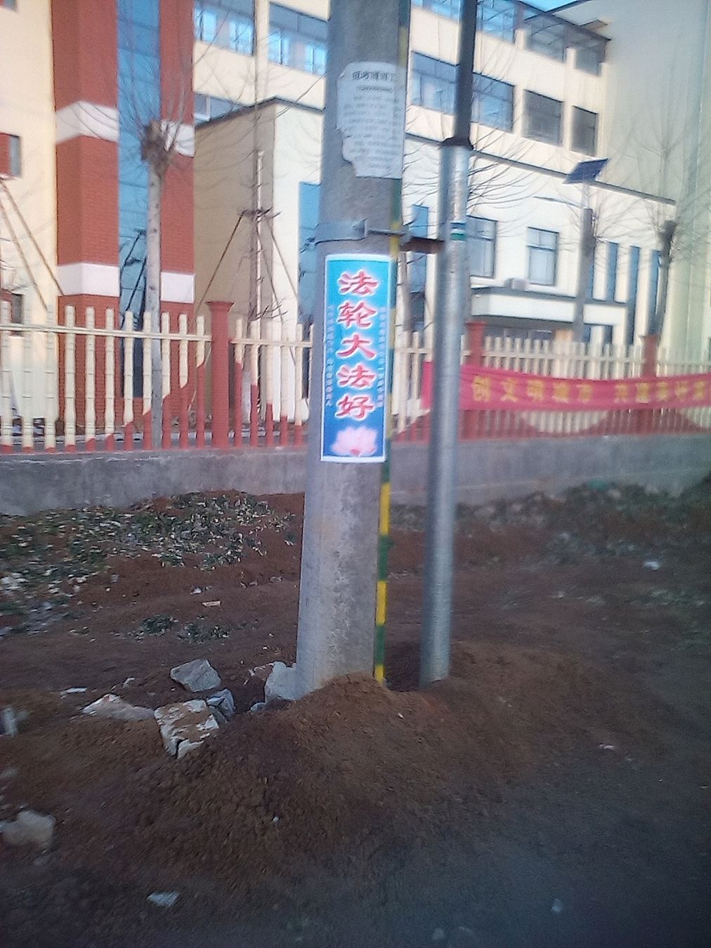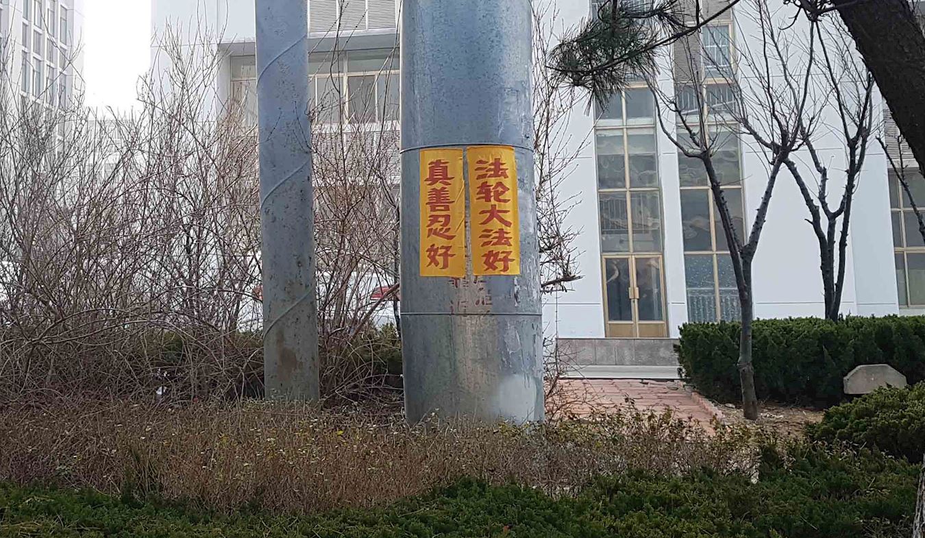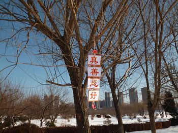 【明慧网二零一七年二月十六日】金鸡报晓,新年来到,在中国大陆很多地区,人们都能看到“法轮大法好”、“真善忍好”的条幅、树挂或粘帖,也能看到图文并茂的海报、展板,揭露中共江氏一伙对法轮功的迫害
