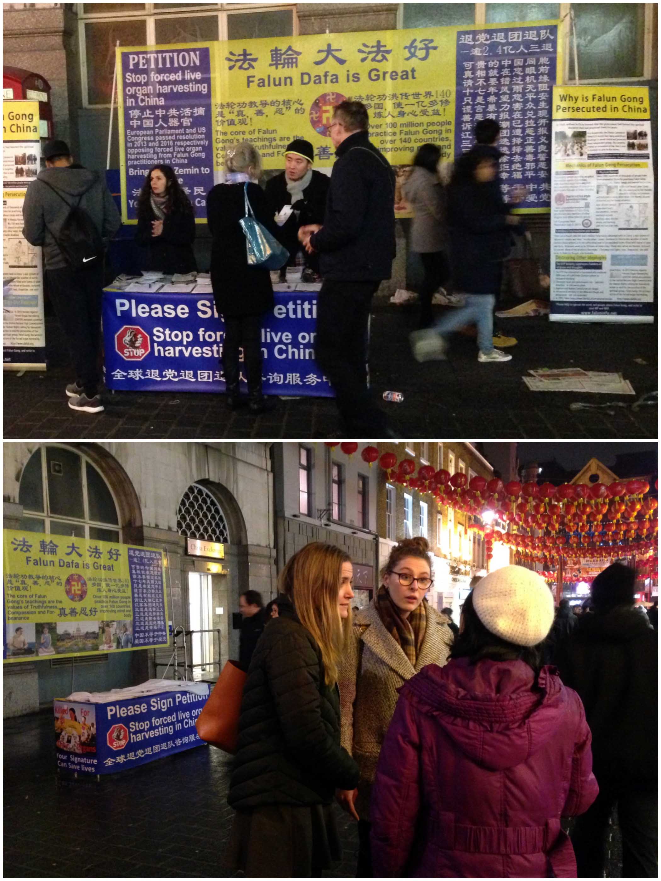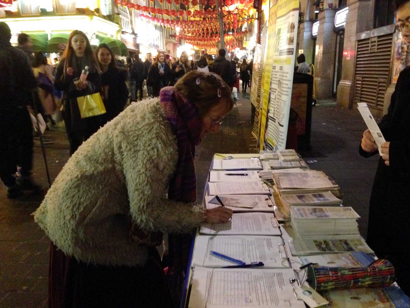 在迎接二零一七中国新年到来的几周里,伦敦唐人街上游客非常多,法轮功学员的讲真相活动让更多来自英国和世界各地的广大民众得以了解法轮功真相,并签名要求制止中共活摘法轮功学员器官的暴行。
