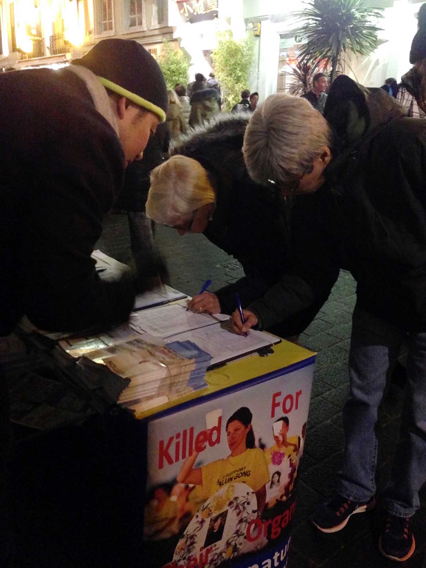 大年初一晚上八点多,马瑞琳在伦敦唐人街上又一次看到法轮功真相展板和反“活摘”征签,她再次毫不犹豫地签下自己的名字,并表示要求立刻制止中共迫害的愿望。她有些激动地对一位法轮功学员说:“这样的事情早就该停止了!为什么那些人能下得去手,对自己的人类同类这样残忍,而人类是造物主的杰作。中国有悠久的文化,可是中共制度又造成那么多问题,很多人被中共制造的假相迷惑了,不,我们不接受中共的欺骗。”