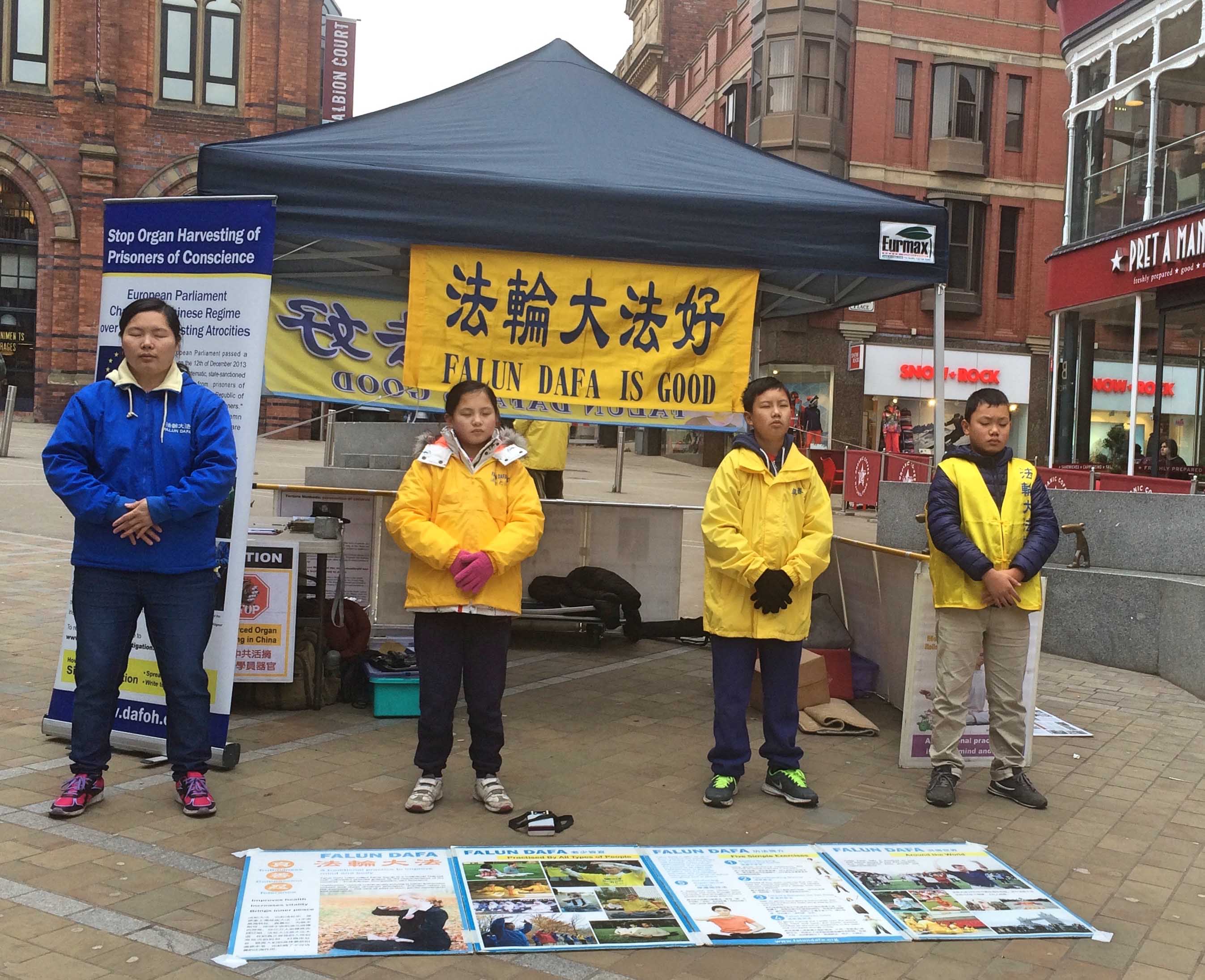 二零一七年二月十九日,英格兰北部利兹附近的法轮功学员来到利兹市中心传播法轮功的真相。图中的法轮功学员正在演示功法。
