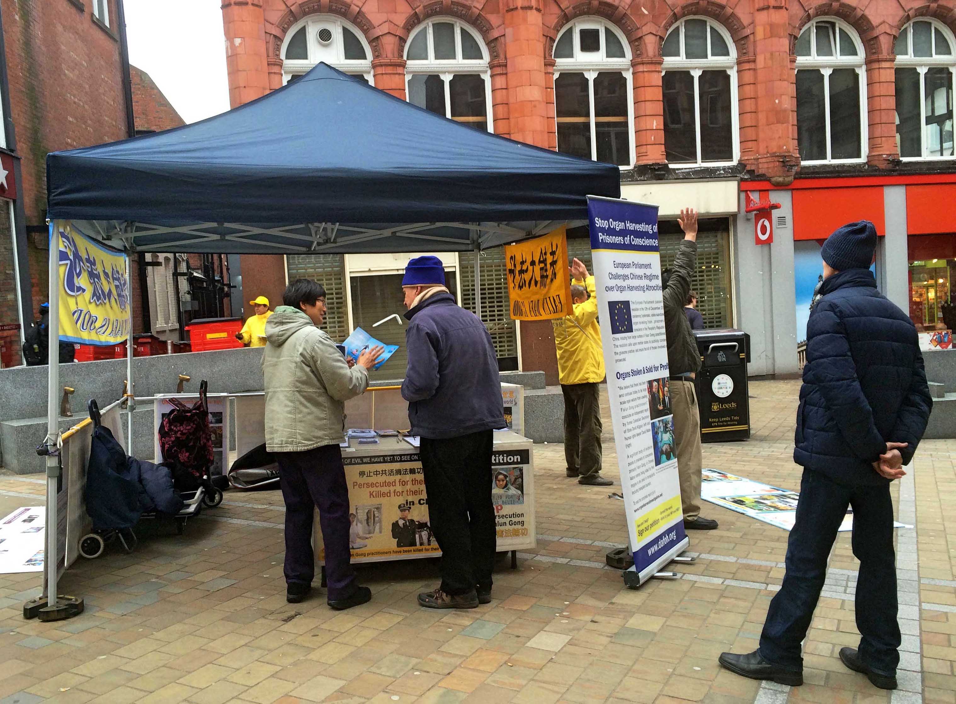 【明慧网二零一七年二月二十一日】二零一七年二月十九日,这是风和日丽的一天,英格兰北部利兹附近的法轮功学员来到利兹市中心介绍法轮功,并揭露中共迫害法轮功的事实。不少行人被祥和的音乐吸引,驻足观看法轮功真相,有的在“反对活摘器官”的征签板上签名,有的询问当地炼功点的时间和地点。