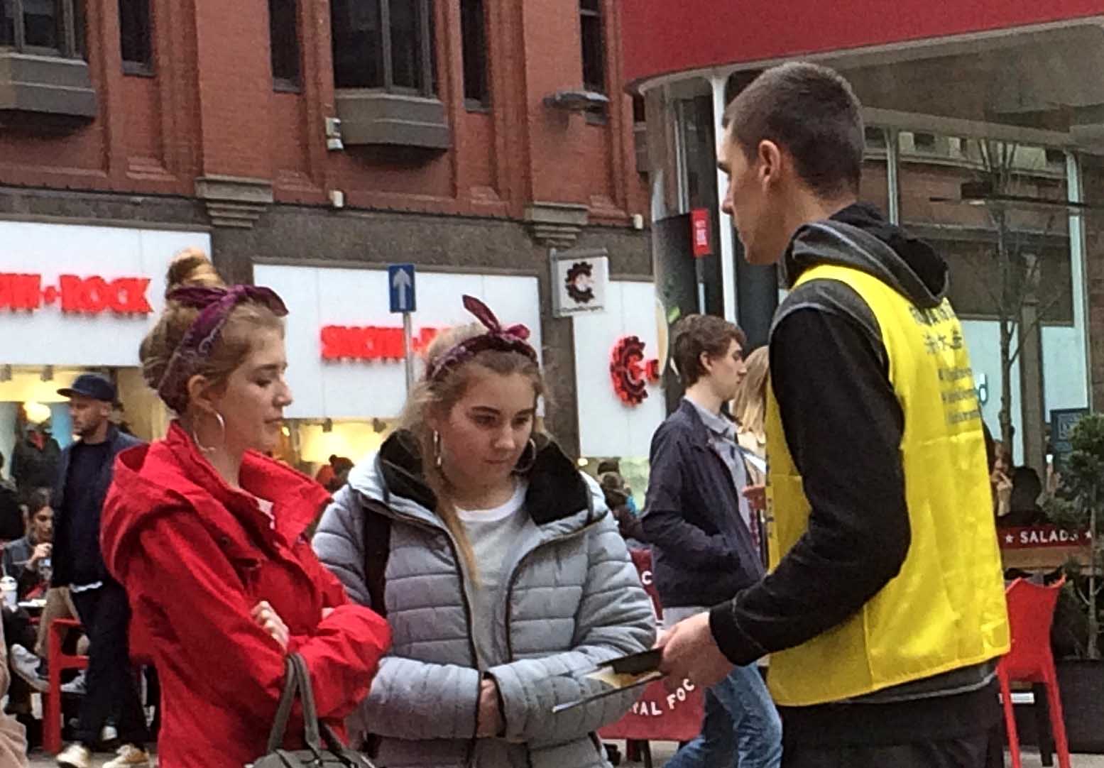 法轮功学员正在向路人讲述法轮功的真相。