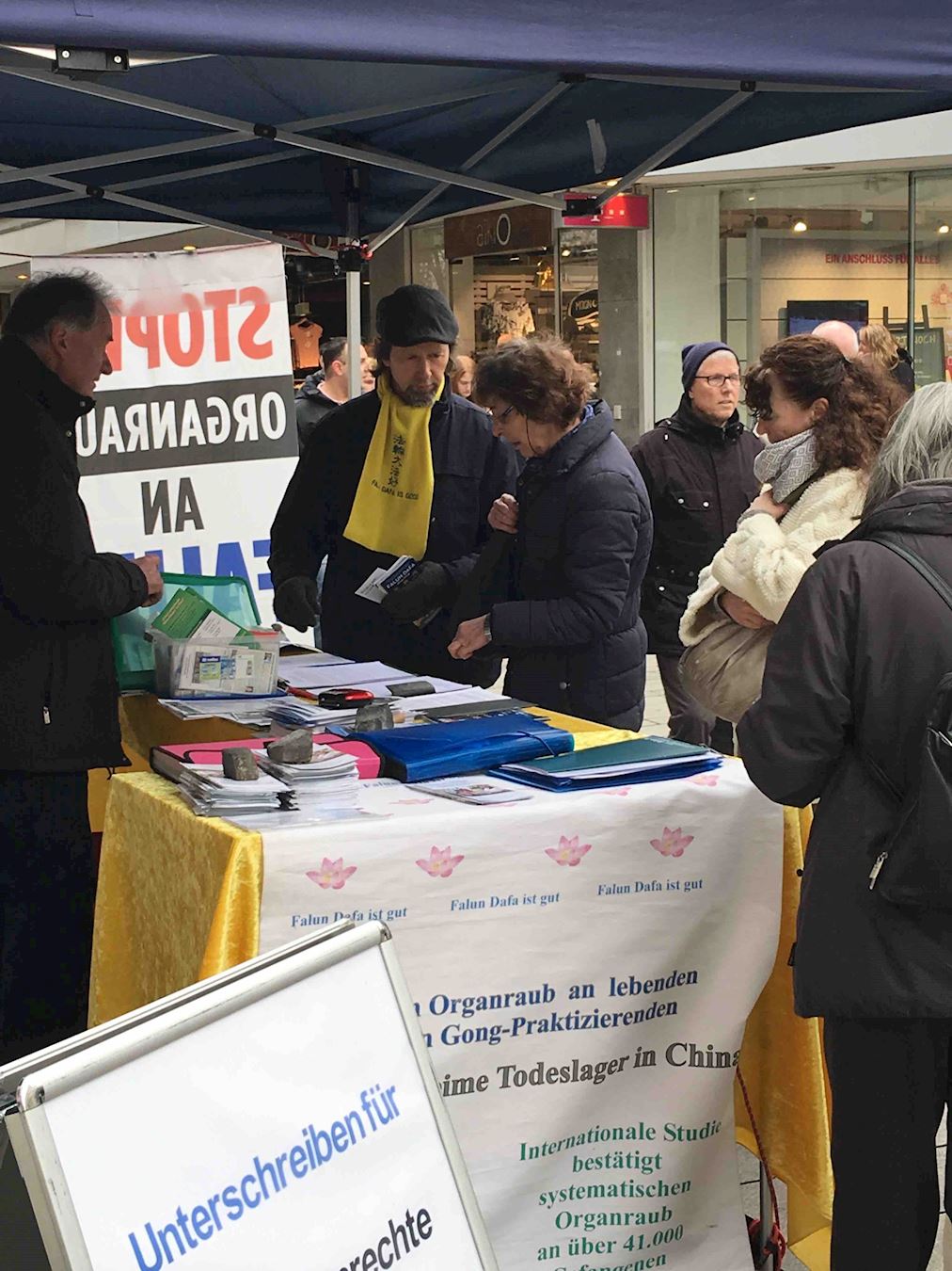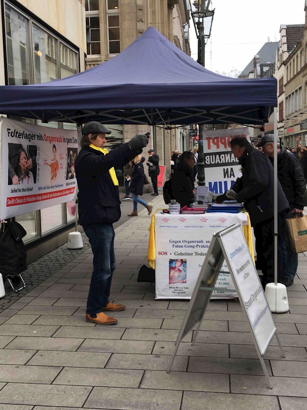一对来自英国伦敦附近的夫妻目前住在杜塞尔多夫。他们惊诧地观看有关迫害演示的图片和一幅展示迫害的画作:“为信仰而被谋杀”。一位学员走上前去,用德文和他们打招呼。当他听出来,那位女士虽然可以听懂德文,但是却不太会说时,他马上改为用英文和他们讲真相,送给他们一份英文传单并告诉他们法轮大法是什么和为什么在中国被迫害。