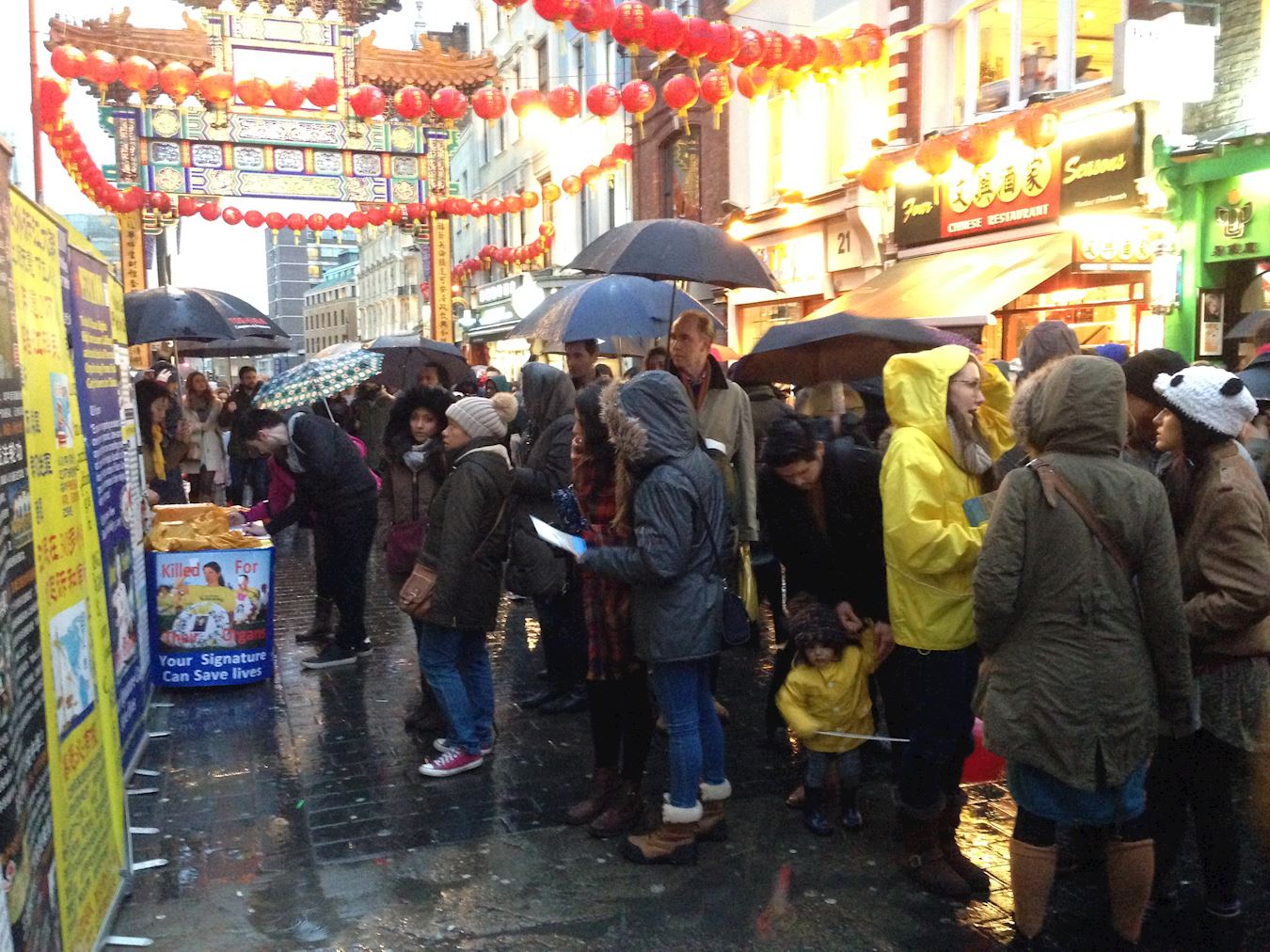 一月二十九日是初二,因为有当地社区庆祝新年的活动,伦敦唐人街人山人海,法轮功学员抓紧机会冒雨向广大民众传播法轮功真相,法轮功真相传单递到成百上千人的手中,炼功学员、真相展板和明慧真相广播吸引了众多华人目光。