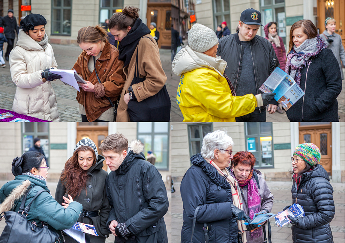 有一对瑞典夫妇在真相展板前仔细地一张一张地看,女士接过资料说:“这么好的功法被迫害,真是不可思议的事。”男士说:“你们出来传播这个消息很重要!非常好!”他说他在南韩首尔也见到过这个功法,有好几百人在炼功音乐很美,炼功场面美好祥和。他还说他们去过中国,很喜爱中国的传统文化、特别是中医。临走时一再感謝法轮功学员告诉了他们真相。