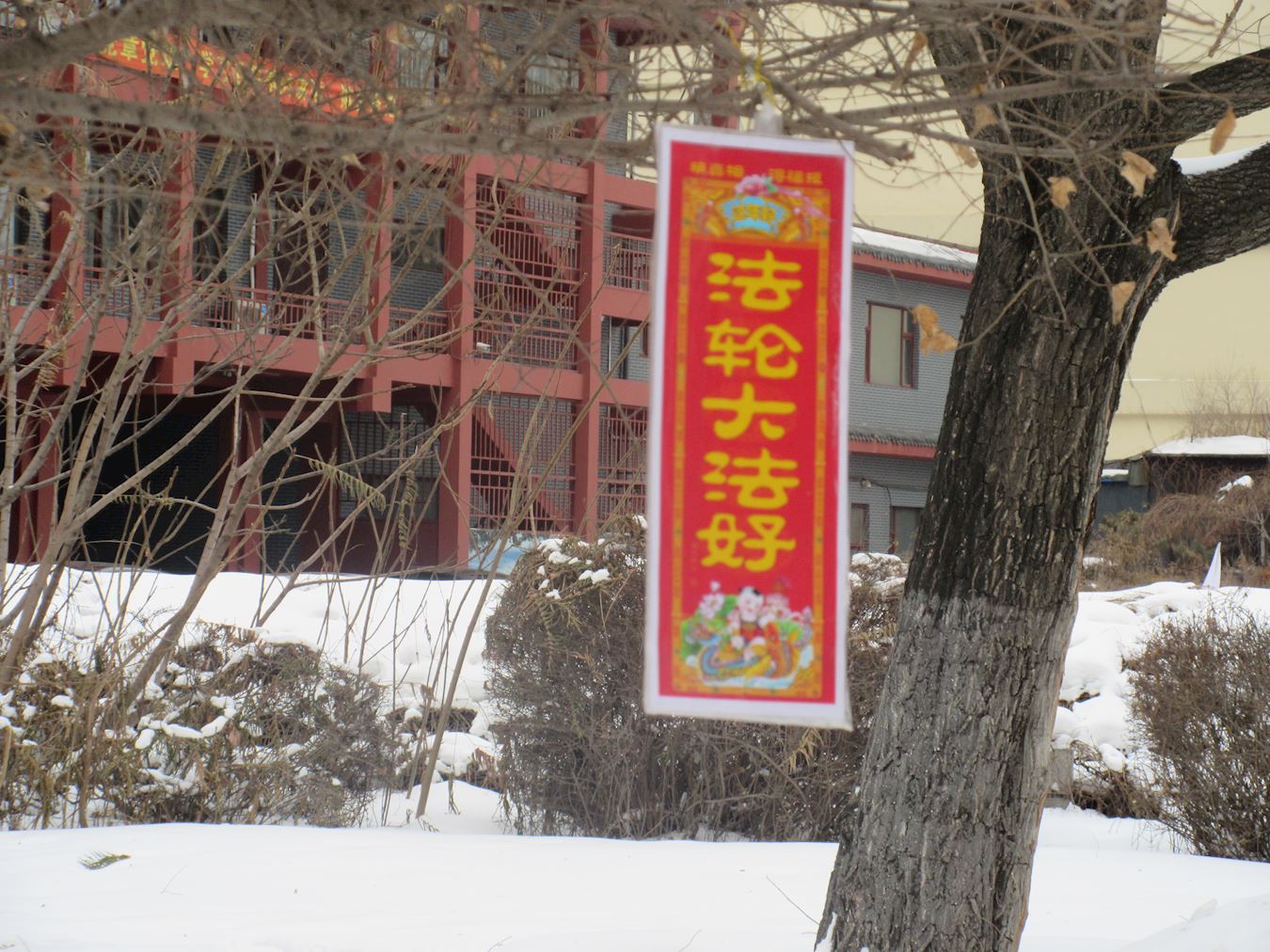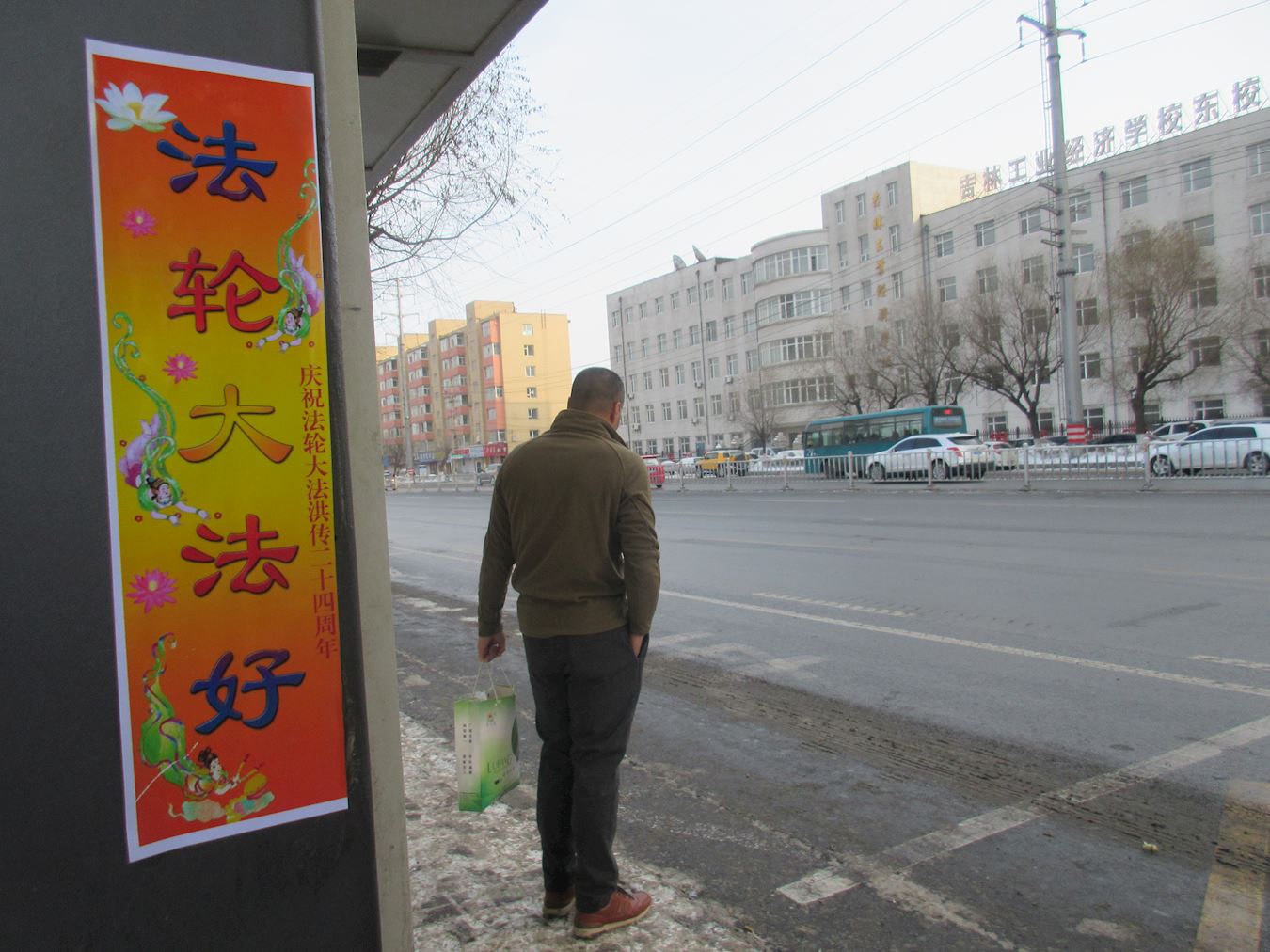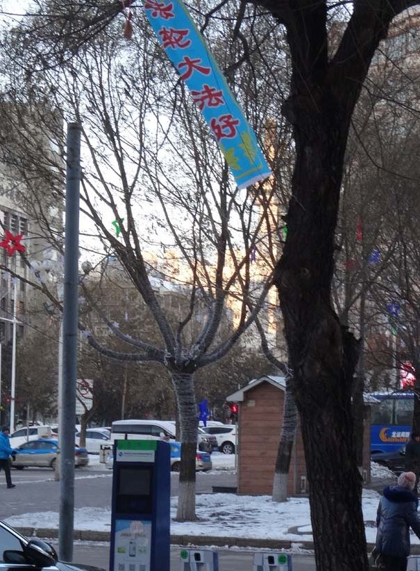 • 佳木斯市年初一早上街道上的法轮功真相条幅展幅