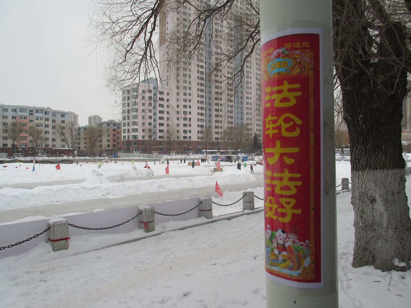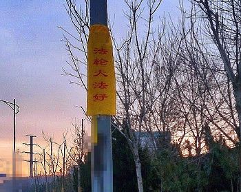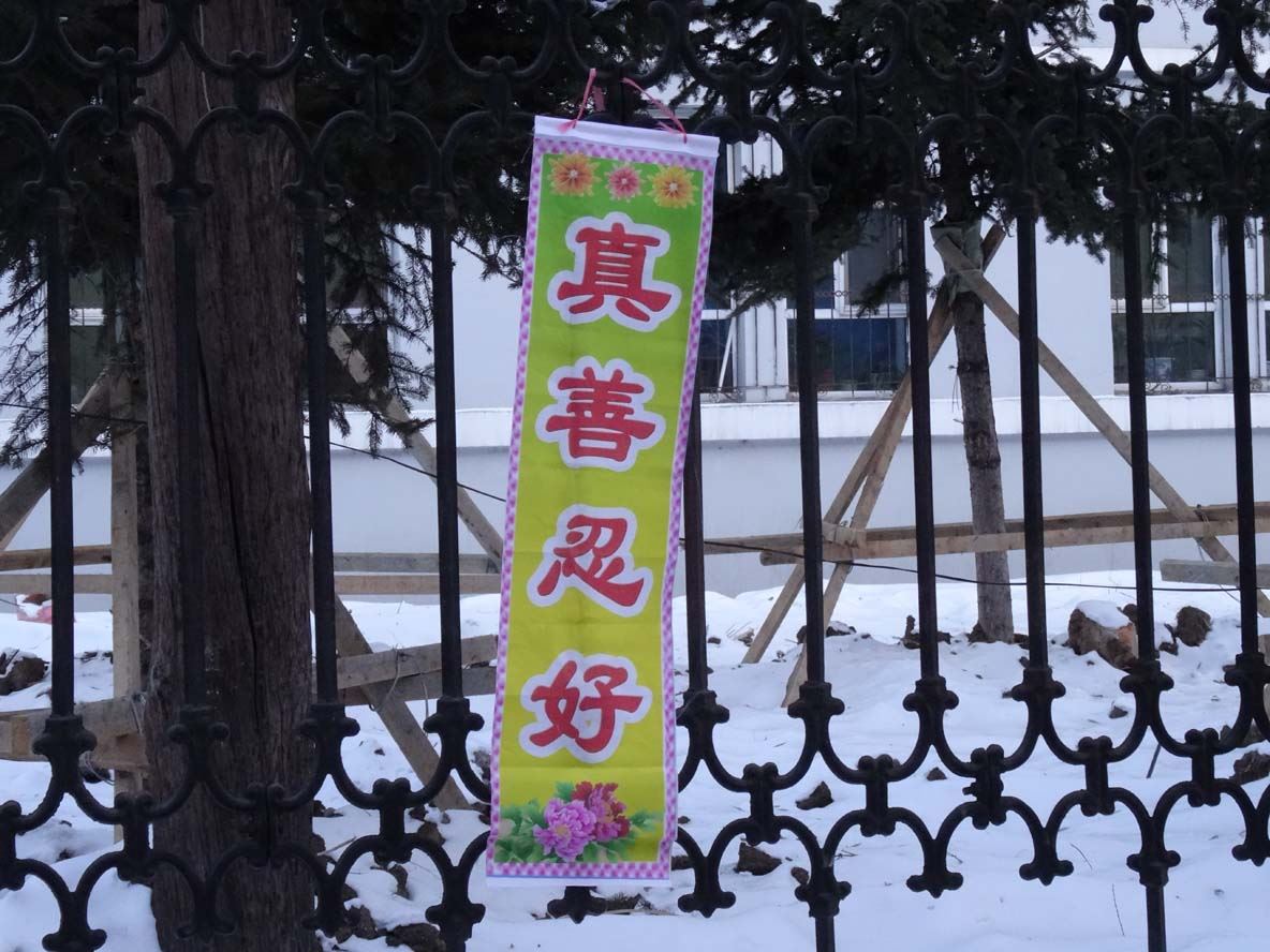 佳木斯市年初一早上街道上的法轮功真相条幅展幅