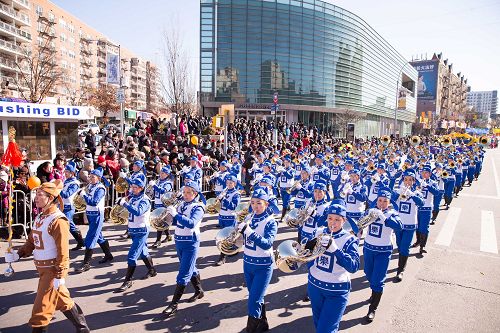 法轮功队伍由七个方阵五百人组成。近二百人身着古装的天国乐团气势恢宏,是游行队伍中唯一的华人乐团。奏响的“法轮圣王”、“法正乾坤”等乐曲,乐音辉煌、振奋人心。