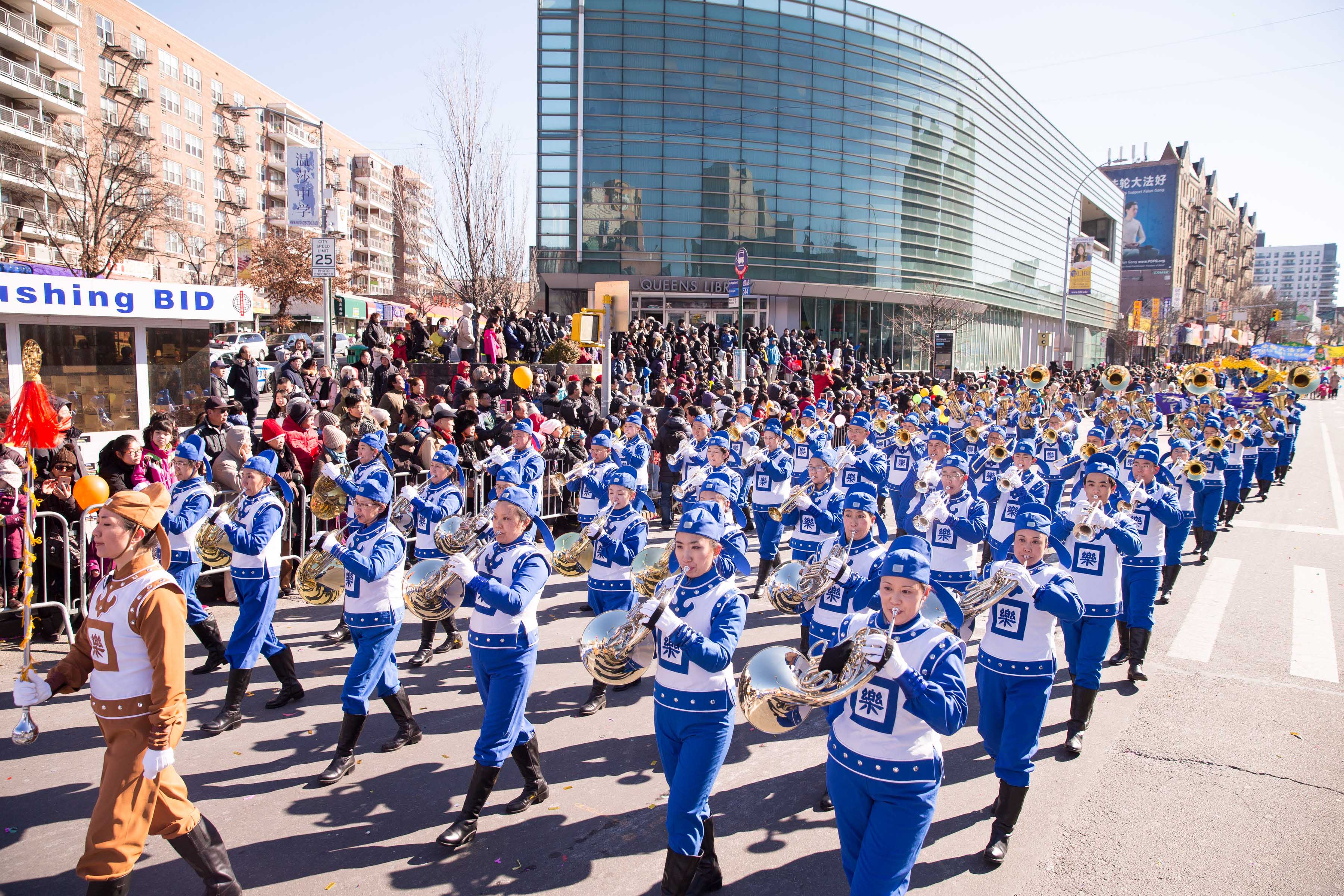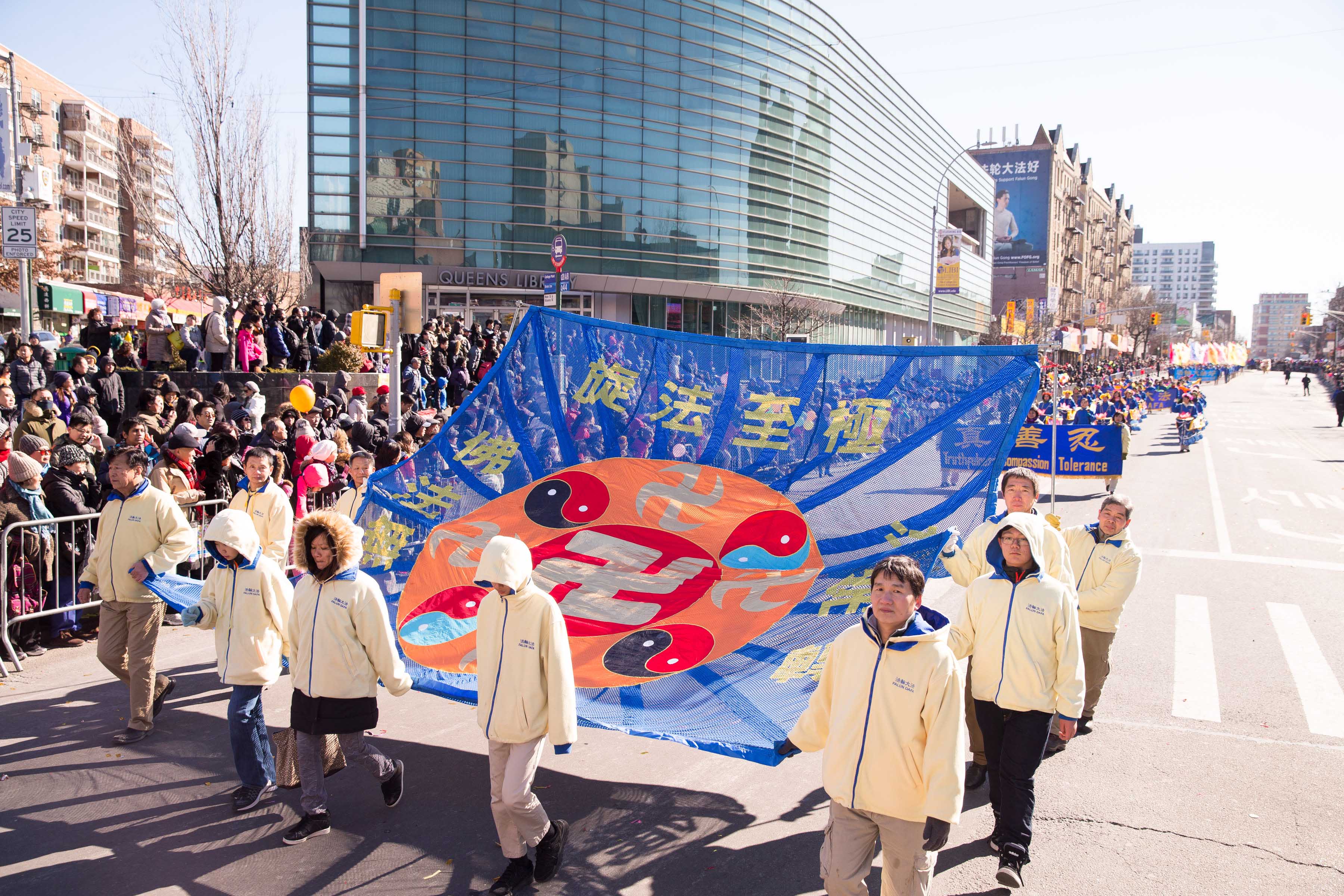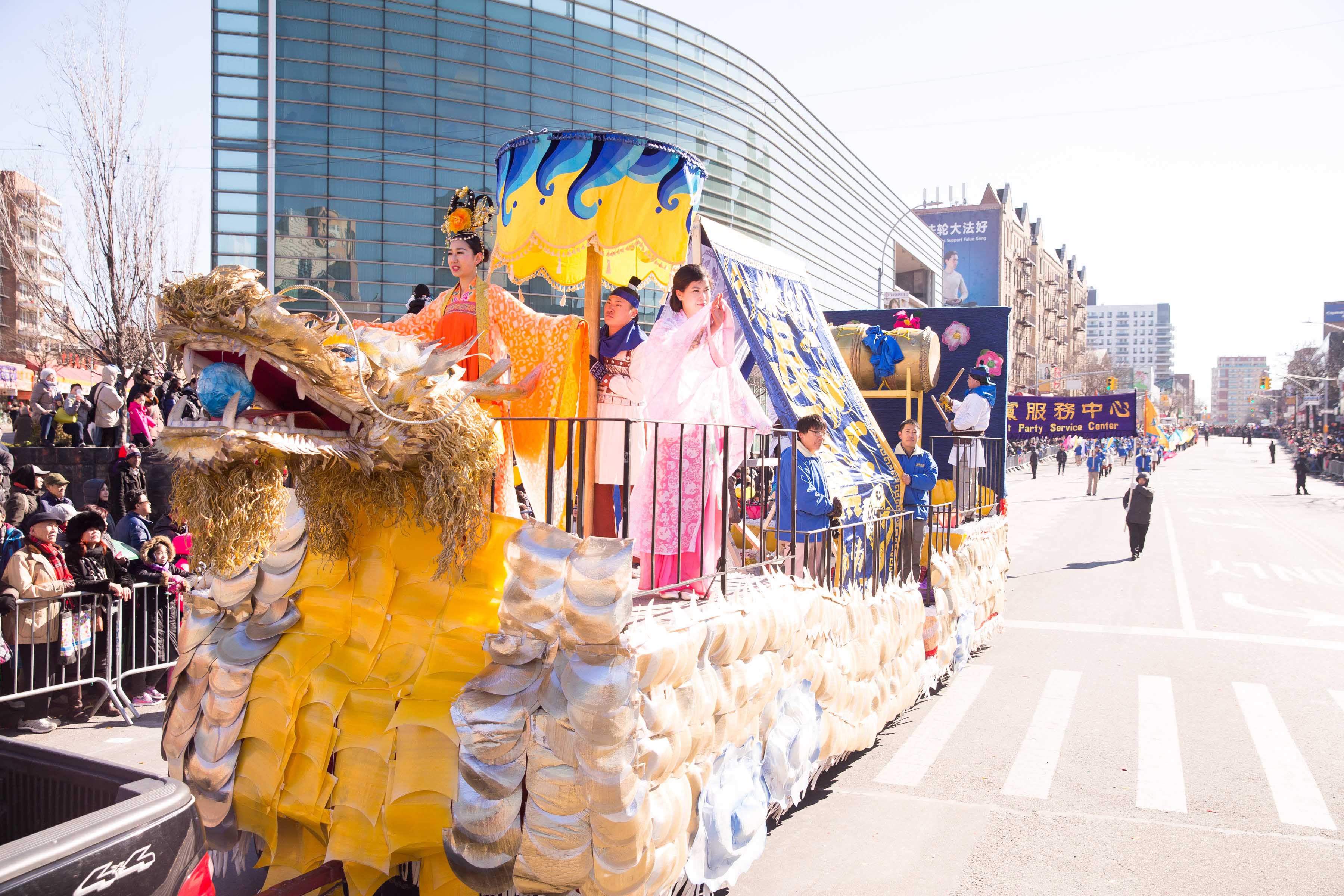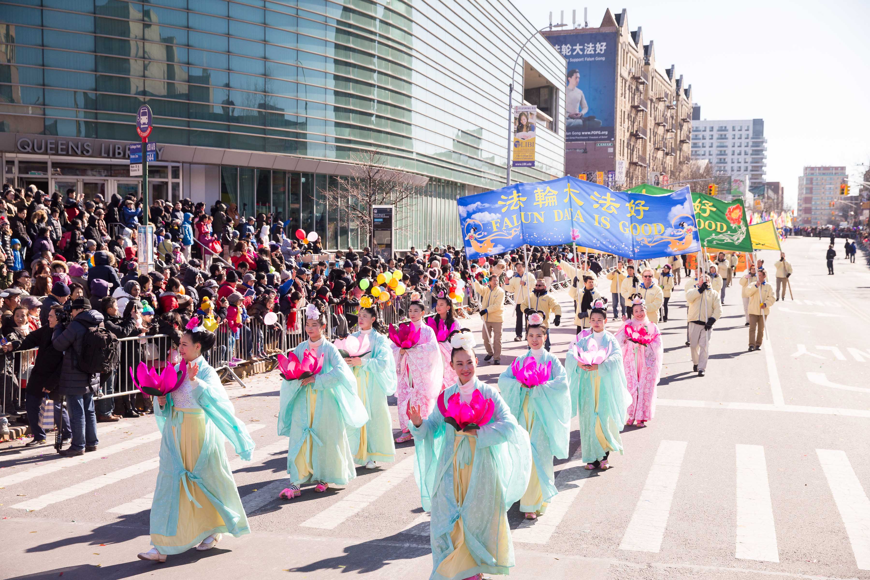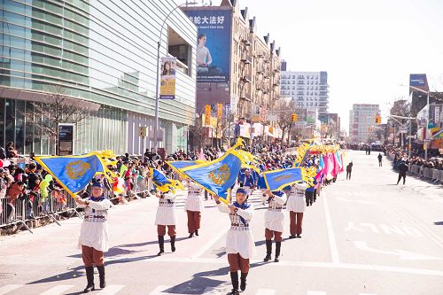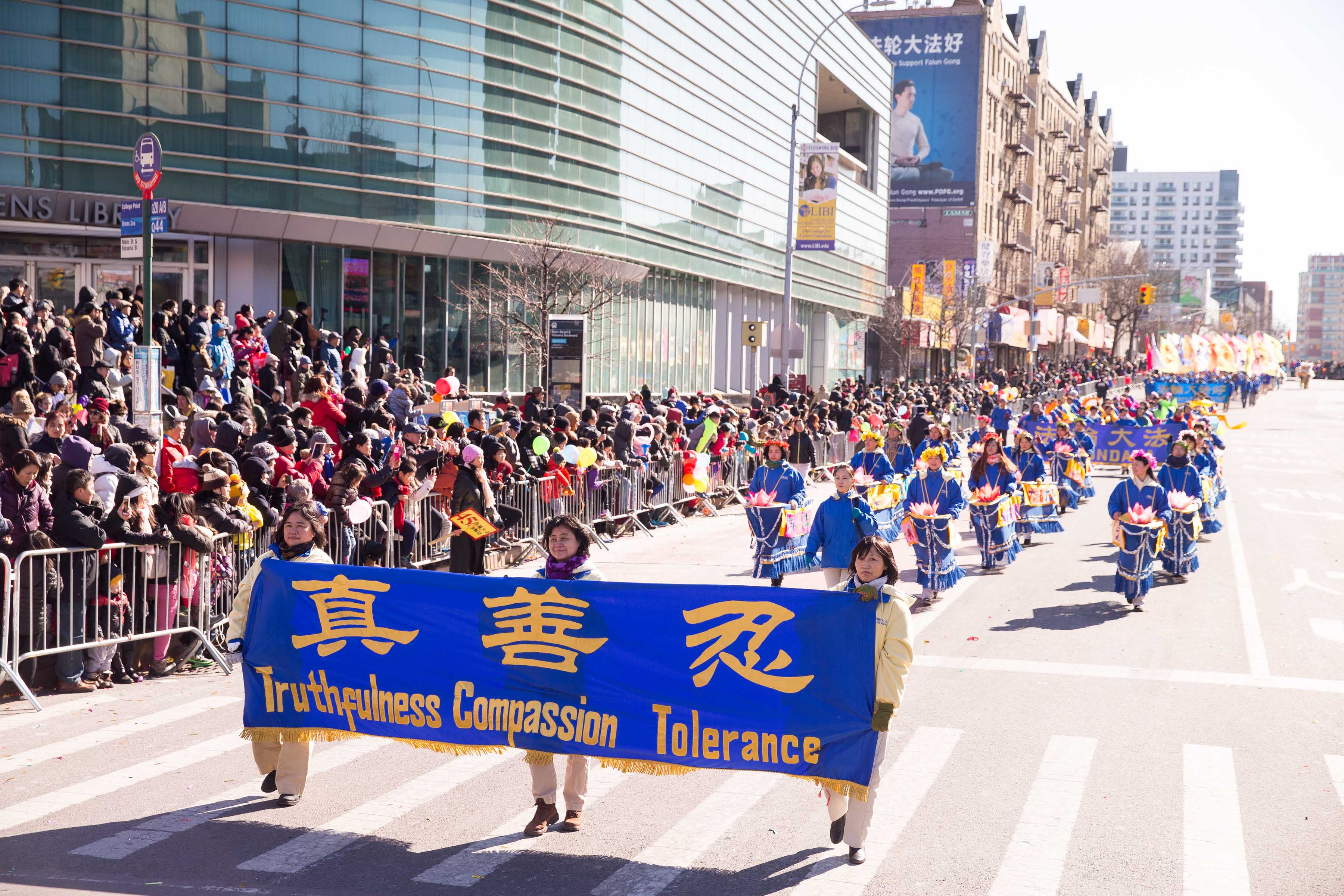 而由西人法轮功学员组成的舞龙队舞动着龙身上下翻腾;古装仕女则手提“真善忍”字样的彩灯,翩翩而来,为民众送上美好祝愿。威武的武士旗阵,驱邪灭乱,祈福华人社区,新年新气象。还有摇曳小花船和新增加的彩绸队,贺岁送祝福。“法轮大法好”,“真善忍”的大横幅高高竖立,为民众送去上天的祝福;“法轮大法好”的歌声乐曲伴随着法轮功方阵响彻法拉盛的街头。