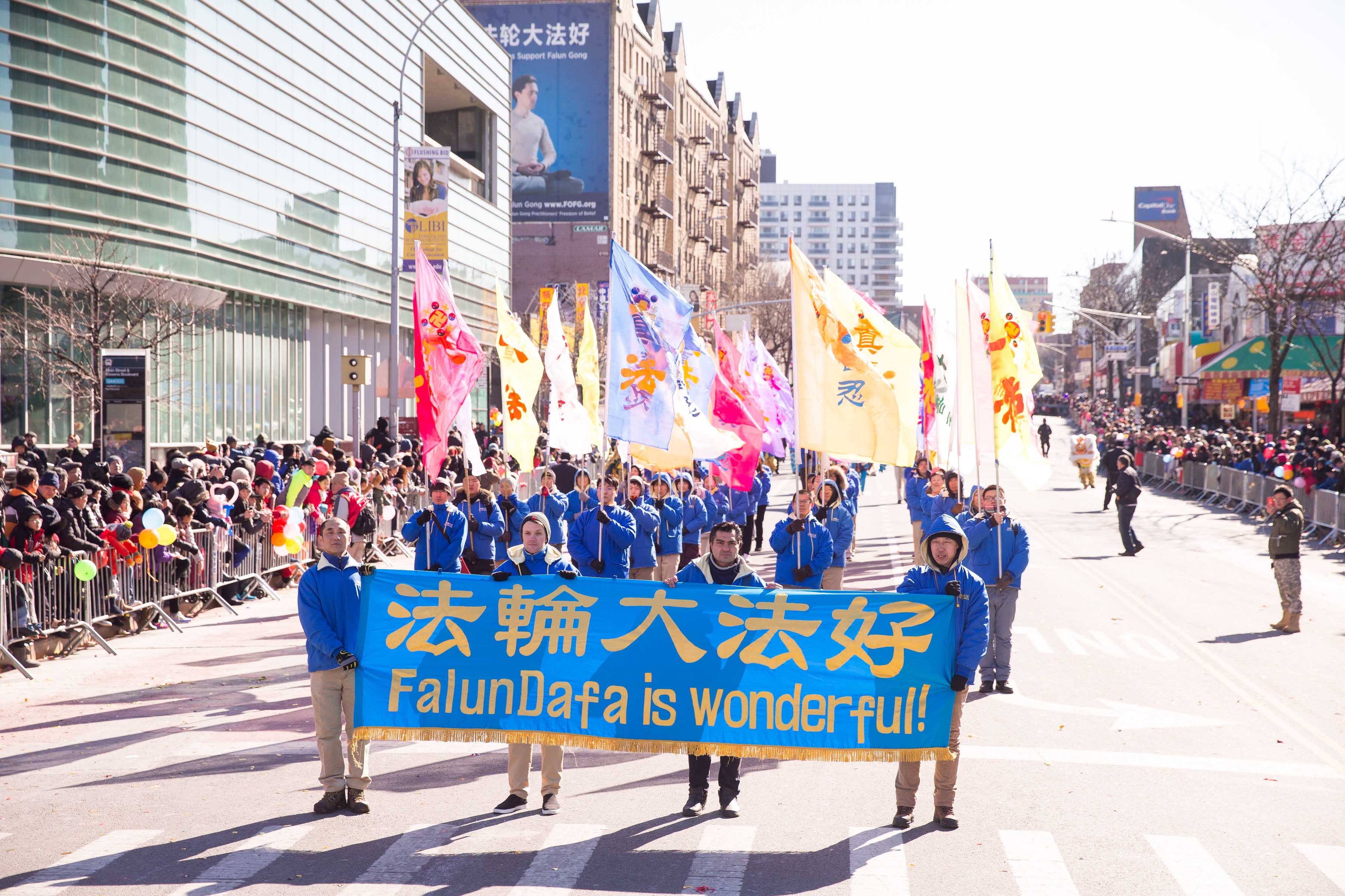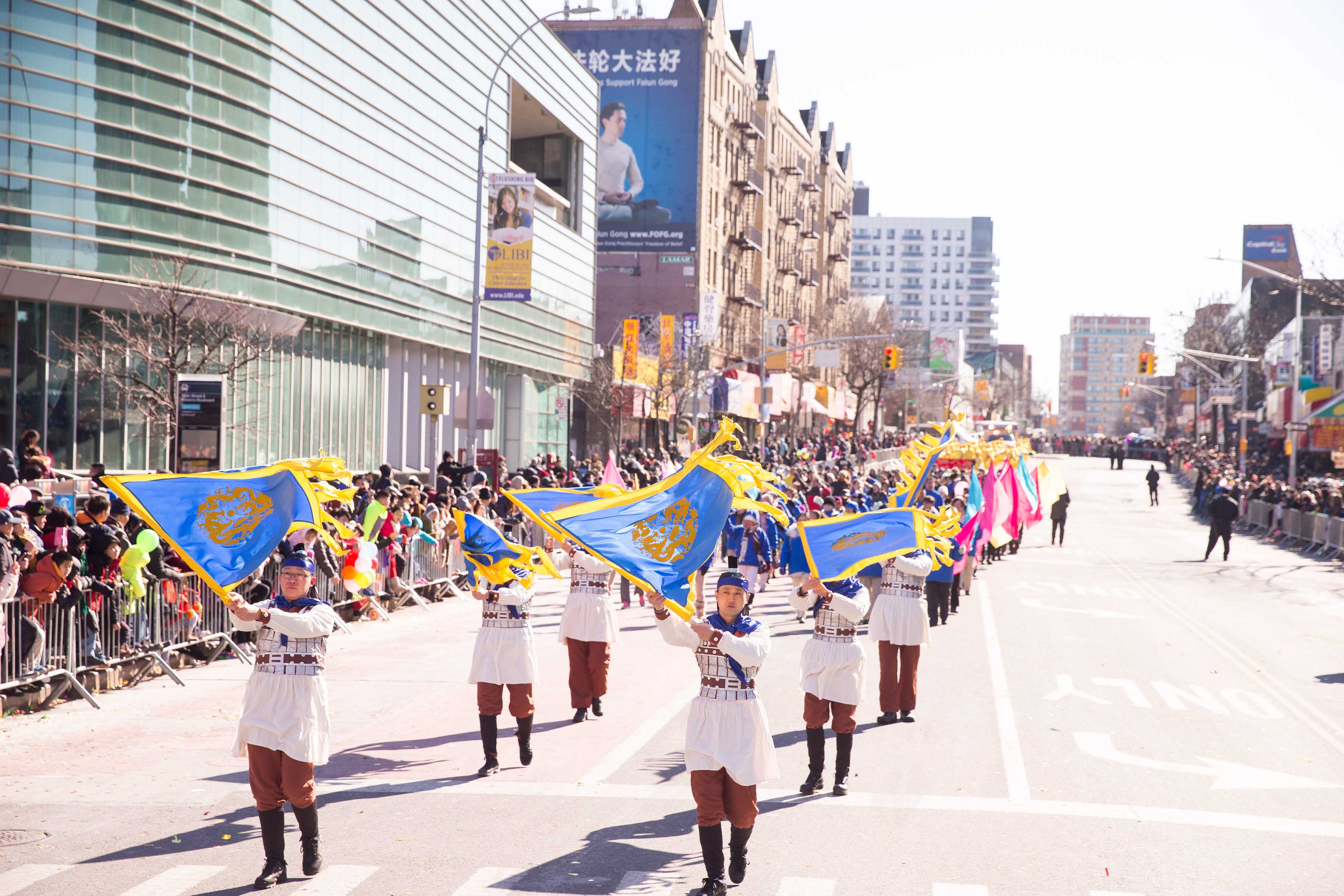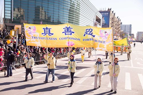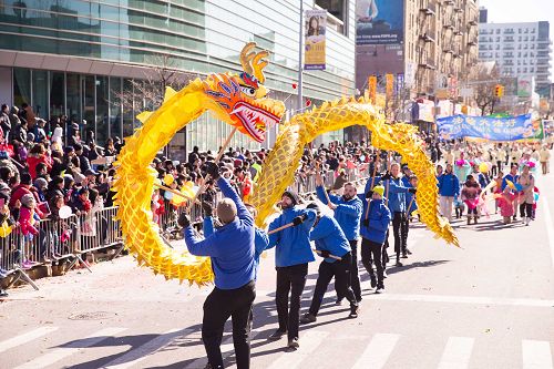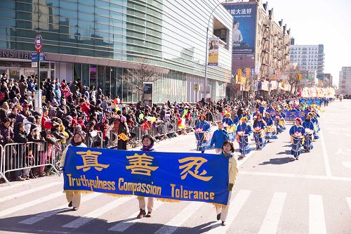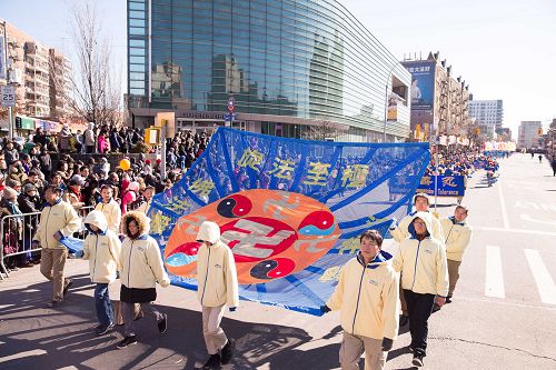 【明慧网二零一七年二月六日】(明慧记者采菊综合报道)二零一七年二月四日,年初八,纽约法拉盛的街头锣鼓喧天,人头攒动,热闹非常,一年一度的“纽约华人新年大游行”盛大登场。